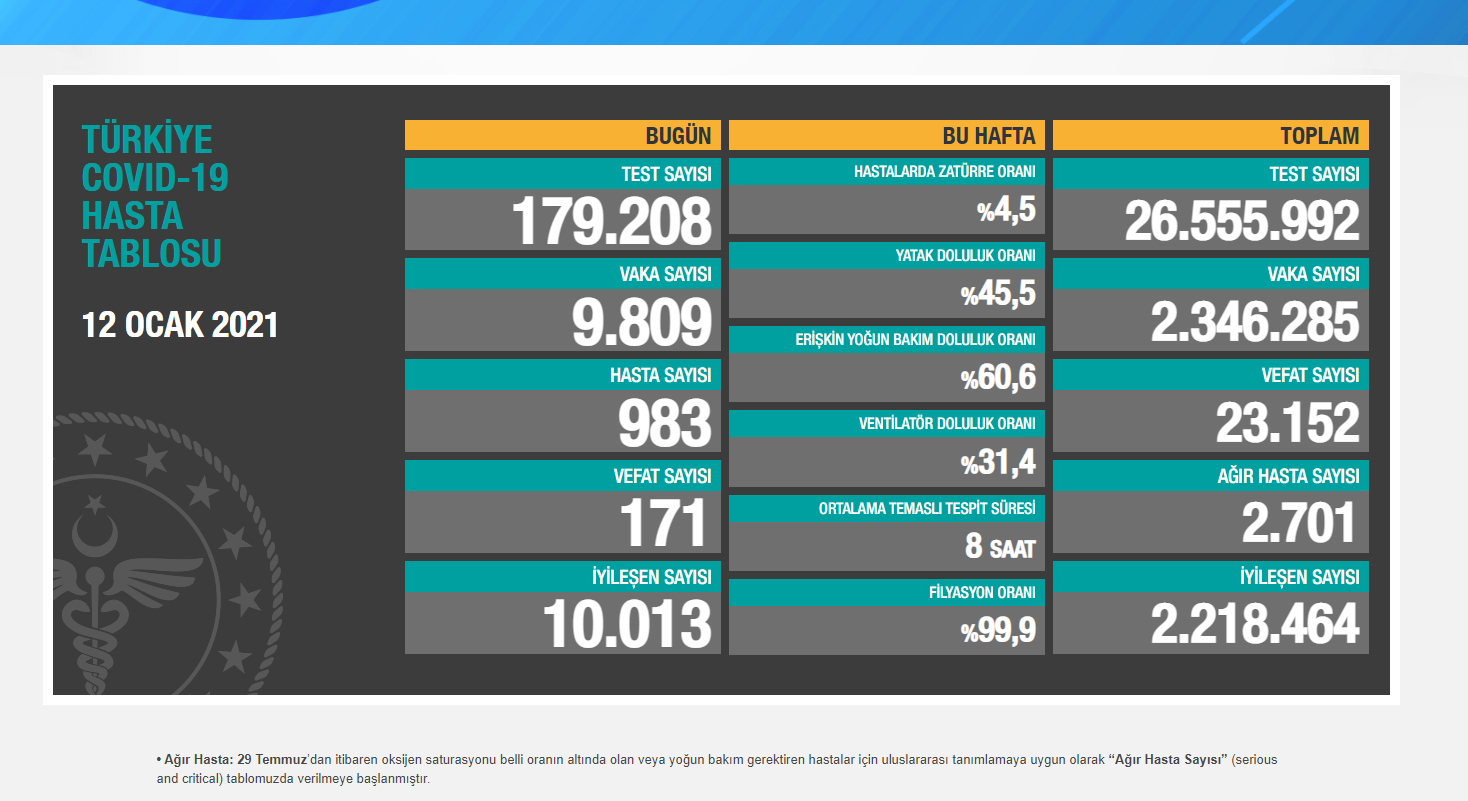 Koca’nın açıklamasına göre Türkiye’de Koronavirüs nedeniyle 171 kişi daha hayatını kaybetti. 983 yeni hasta belirlenirken, 9 bin 809 yeni vaka tespit edildi. Pandemiden dolayı yaşamını yitirenlerin sayısı 23 bin 152’ye, vaka sayısı ise 2 milyon 346 bin 285’e yükseldi.
