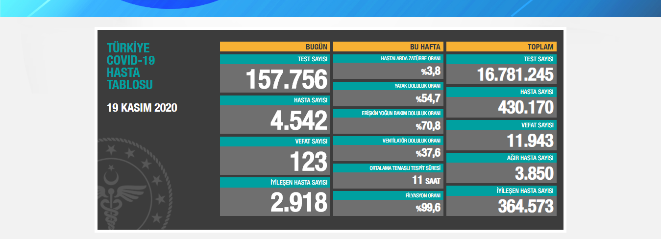 Sağlık Bakanlığı’nın açıkladığı günlük verilere göre son 24 saatte Türkiye’de 123 yurttaş koronavirüs nedeniyle yaşamını yitirdi, 4 bin 542 yeni ‘hasta’ tespit edildi.