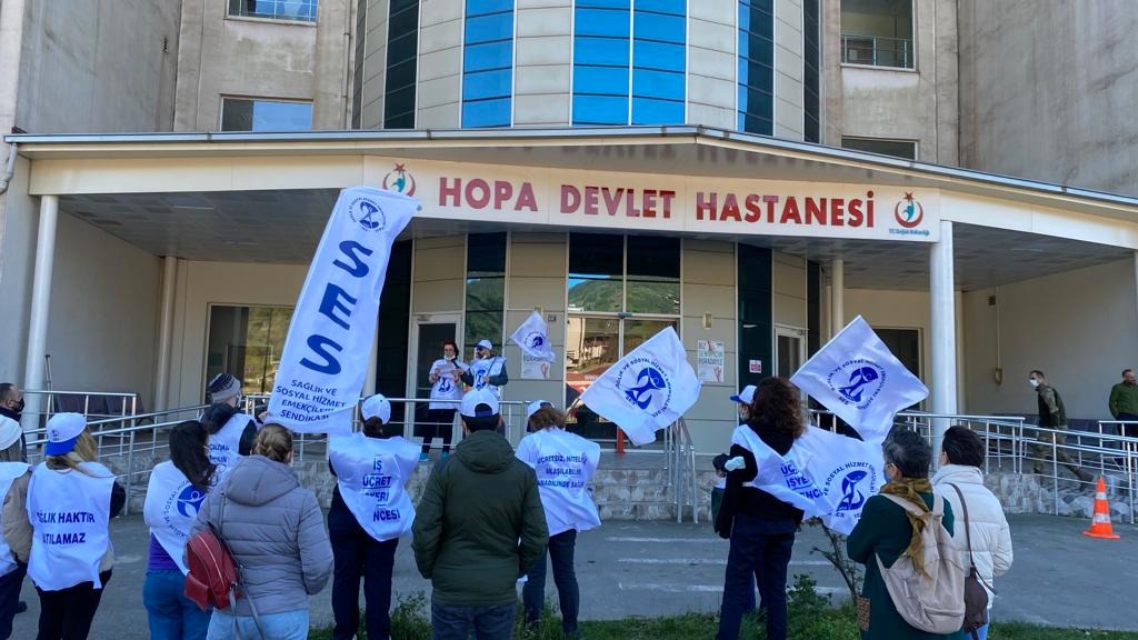 Sağlık ve Sosyal Hizmet Emekçileri Sendikası’nın (SES) çağrısıyla Hopa Devlet Hastanesi’nde iş bırakma eylemi gerçekleştiren sağlık emekçileri hastane bahçesinde bir açıklama yaptı.