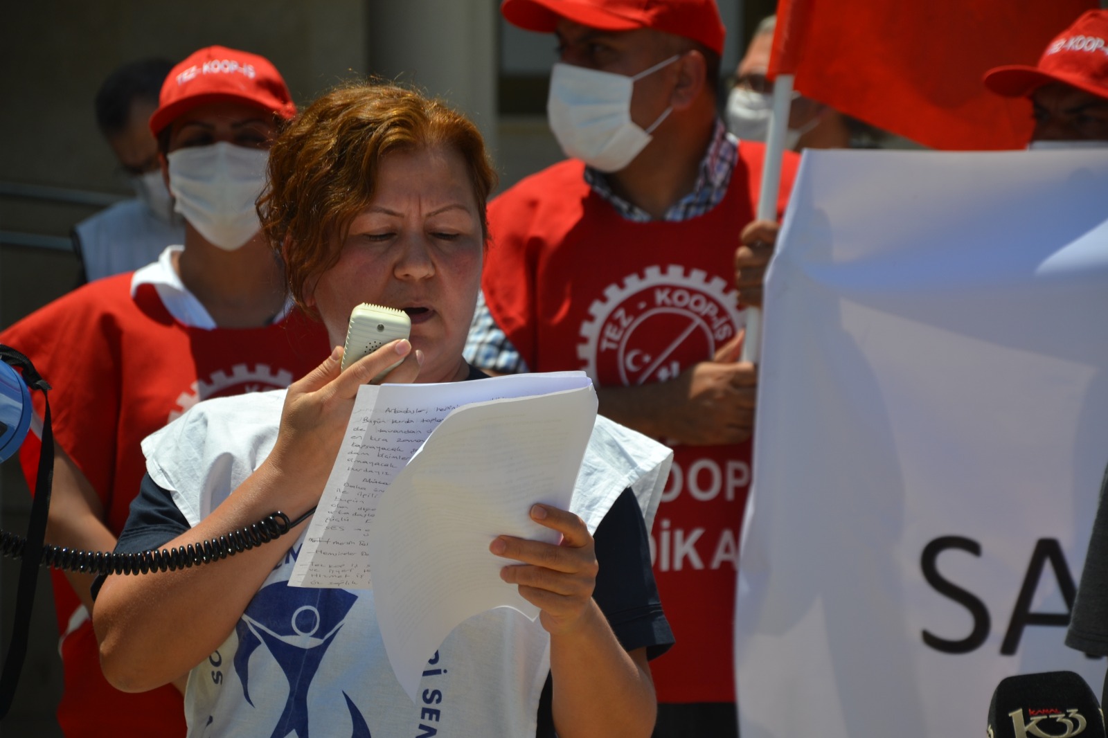 Mersin Tabip Odası, Sağlık ve Sosyal Hizmet Emekçileri Sendikası (SES), Mersin Hemşireler Derneği, Tez-Koop-İş Sendikası, Öz Sağlık-İş Sendikası ve Hizmet-İş Sendikası’nın ortaklaşarak düzenlediği açıklamada, basın metnini SES Mersin Şubesi Yürütme Kurulu Üyesi Sevgi Başkavak okudu.