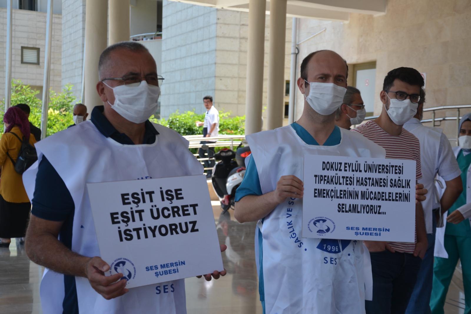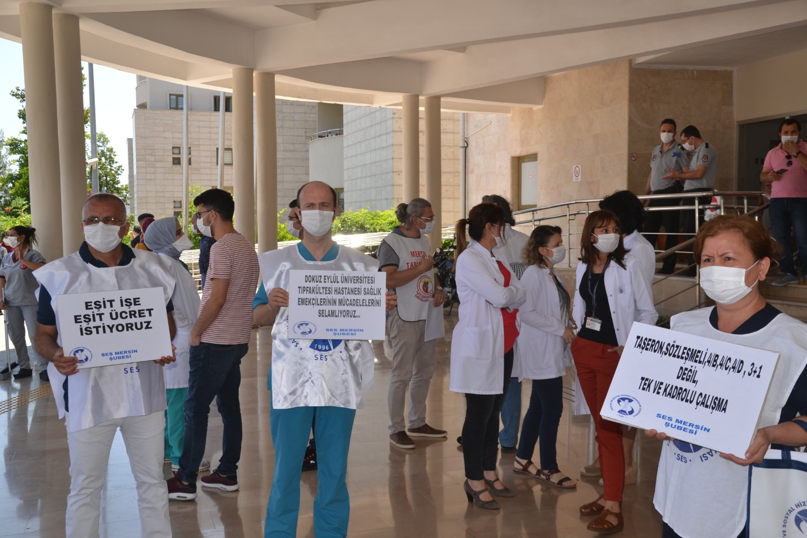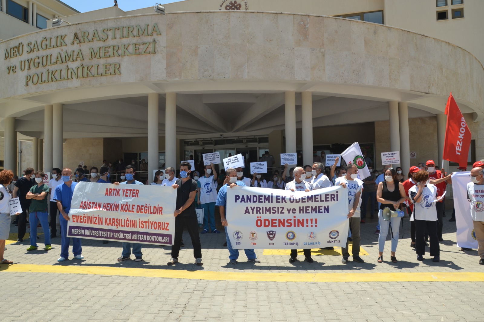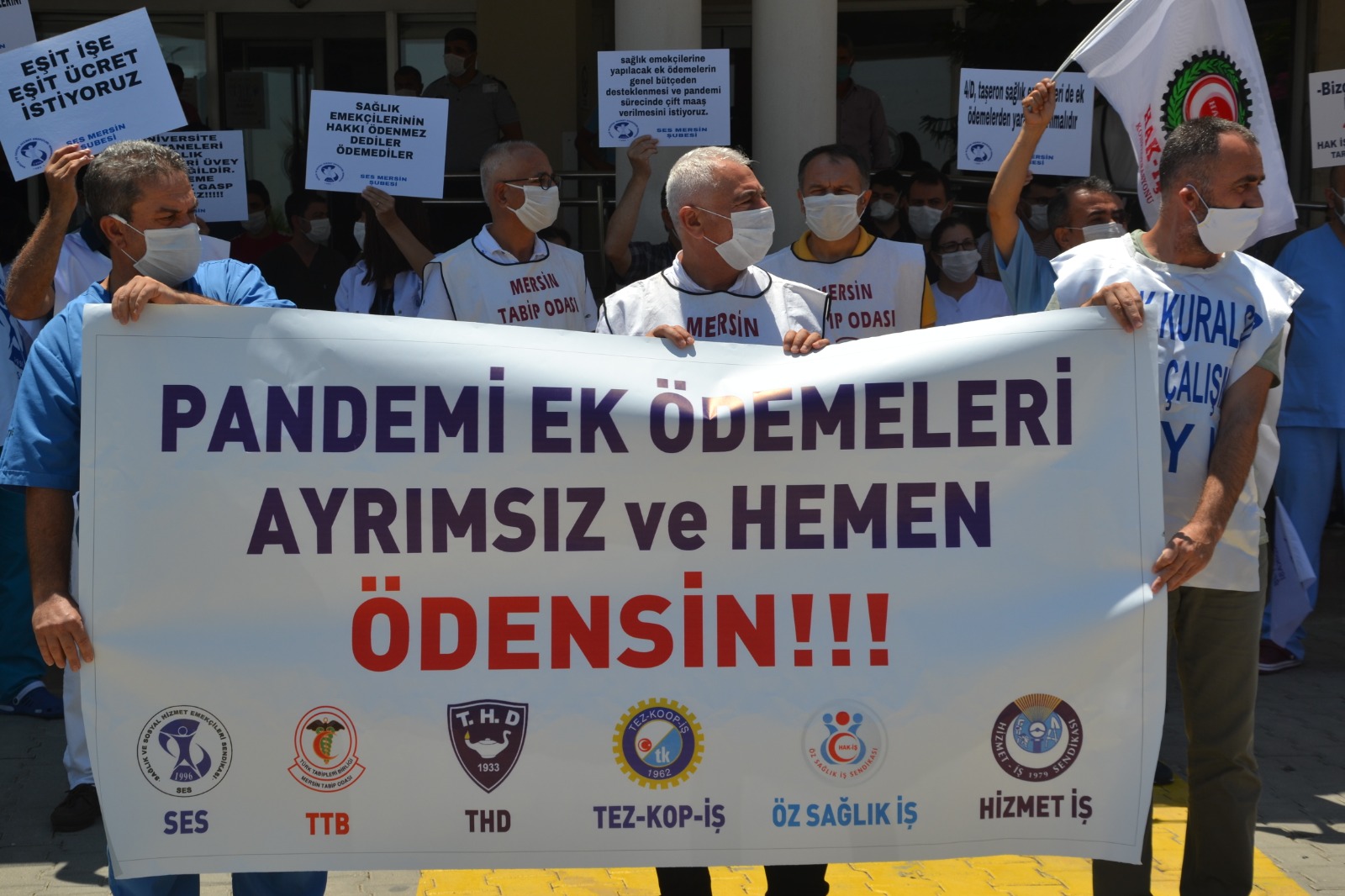 Covid-19’la mücadelede gösterdikleri azim ve başarıdan dolayı tüm ülkede takdir toplayan sağlık çalışanları, sorunlarına çözüm arıyor. Sağlık Bakanlığınca yapılan ek ödemelerden, üniversite hastanelerinde çalışan personeller mahrum bırakıldı. Mersin Üniversitesi Tıp Fakültesi sağlık çalışanları, pandemide yaşadıkları hak kaybına ilişkin fakülte önünde basın açıklaması yaptı.