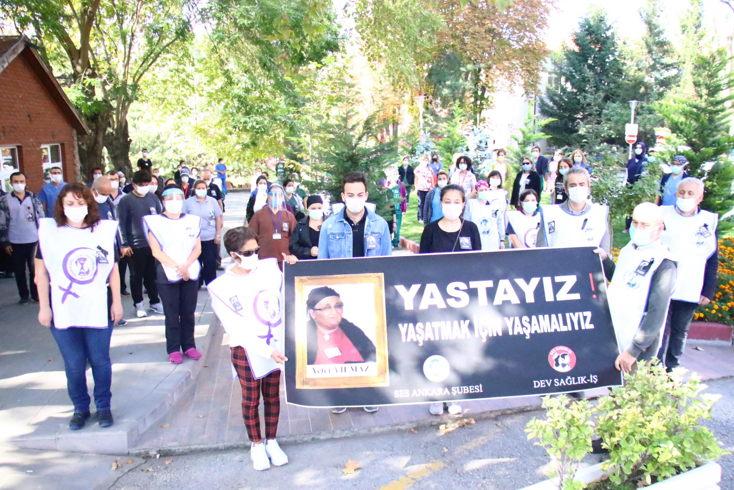 Sağlık ve Sosyal Hizmet Emekçileri Sendikası sağlık çalışanı Yeter Yılmaz için yapılan anma etkinliğinde konuşan SES Ankara Şube Eş başkanı Nazan Karacabey, “Alınmayan önlemler ve ağır iş yükünden dolayı arkadaşlarımızı kaybetmeye devam ediyoruz” dedi.