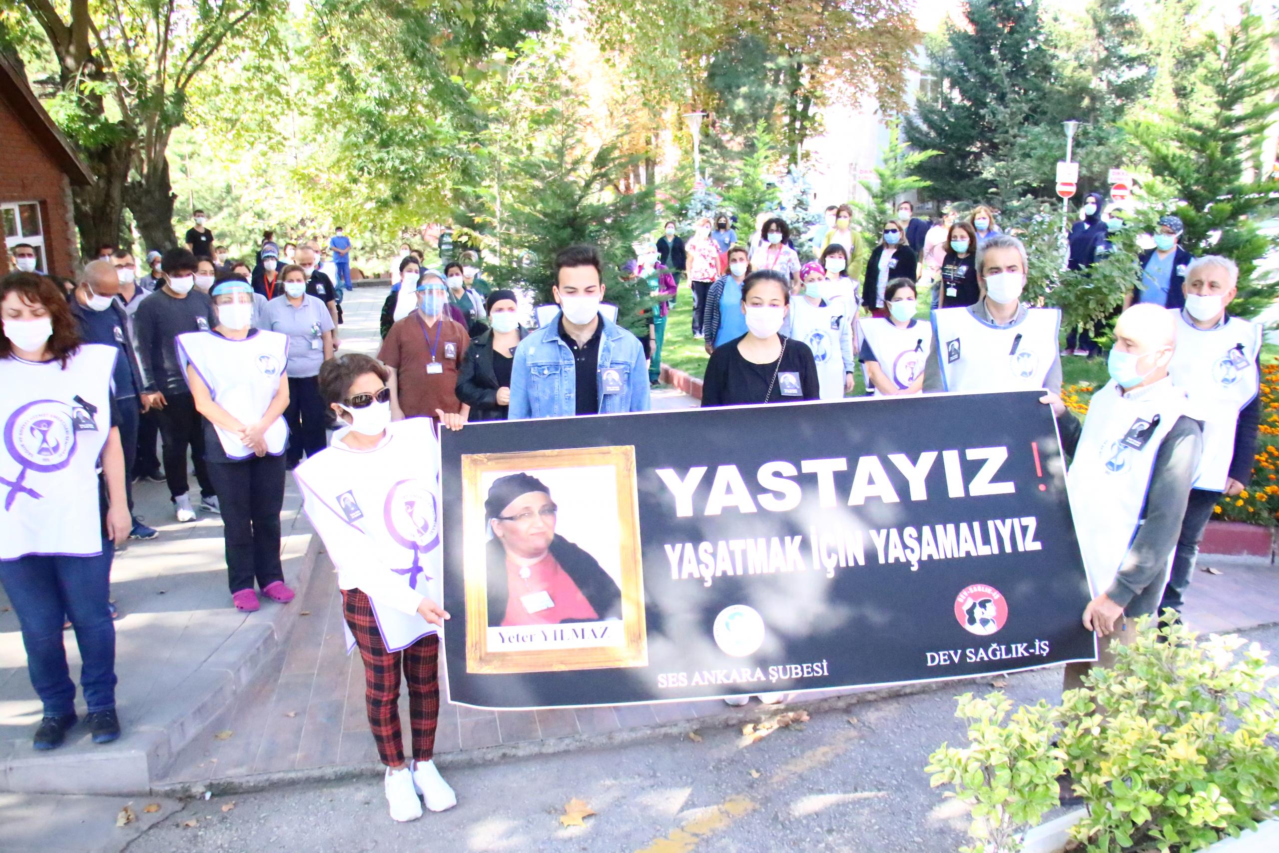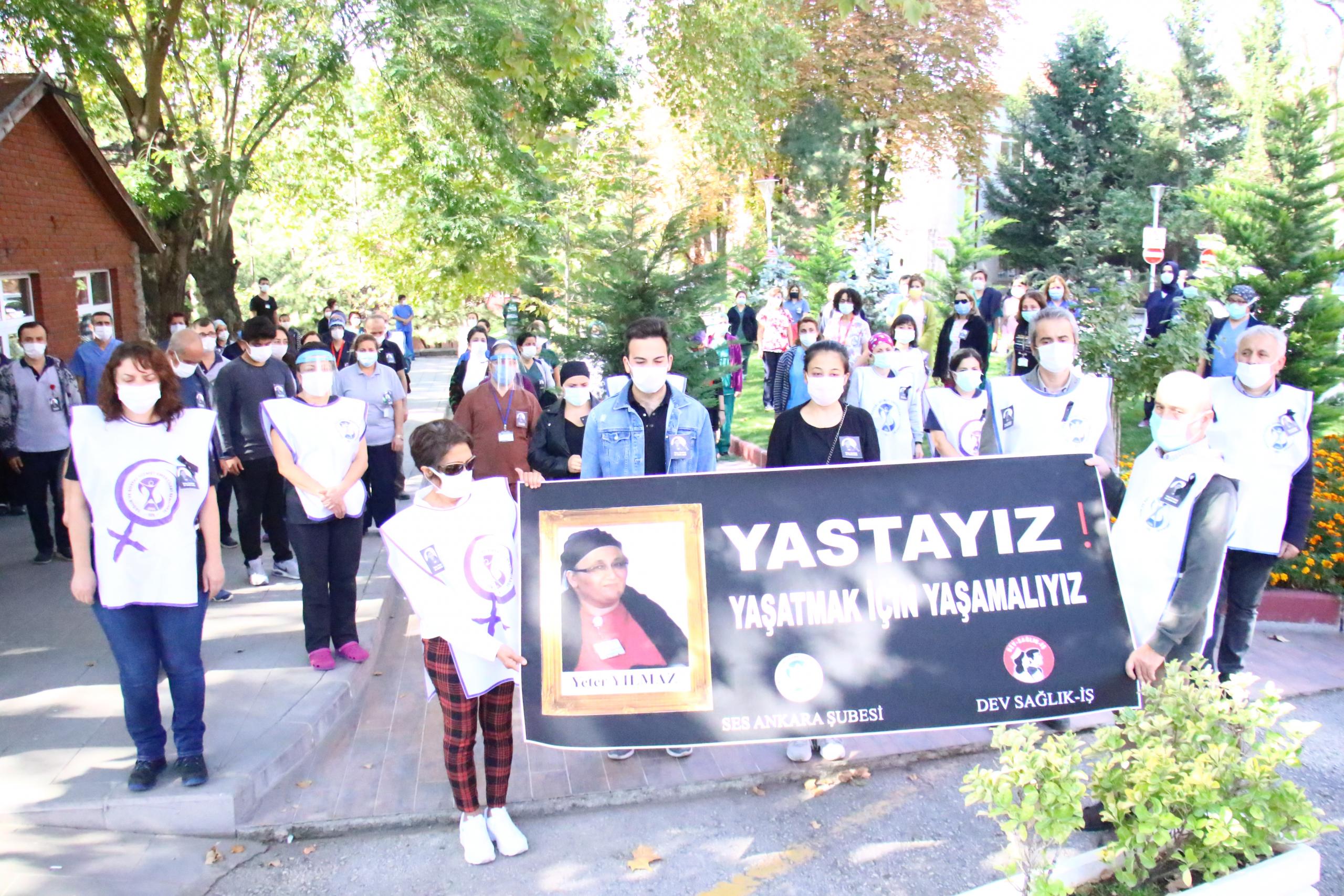Sağlık ve Sosyal Hizmet Emekçileri Sendikası (SES) Ankara Şubesi ve Devrimci Sağlık İşçileri Sendikası (Dev Sağlık-İş) koronavirüs (Kovid-19) nedeniyle yaşamını yitiren sağlık emekçisi Yeter Yılmaz şahsında tüm sağlık çalışanları için Ankara Üniversitesi Hastanesi Cebeci Kampüsü’nde anma töreni düzenledi. Anmaya SES Merkez Yürütme Kurulu (MYK) üyeleri, Yılmaz’ın ailesi ve mesai arkadaşı katıldı. Anma öncesi basın açıklaması yapılacak kampüs alanı ve çevresi çok sayıda polis tarafından ablukaya alındı.