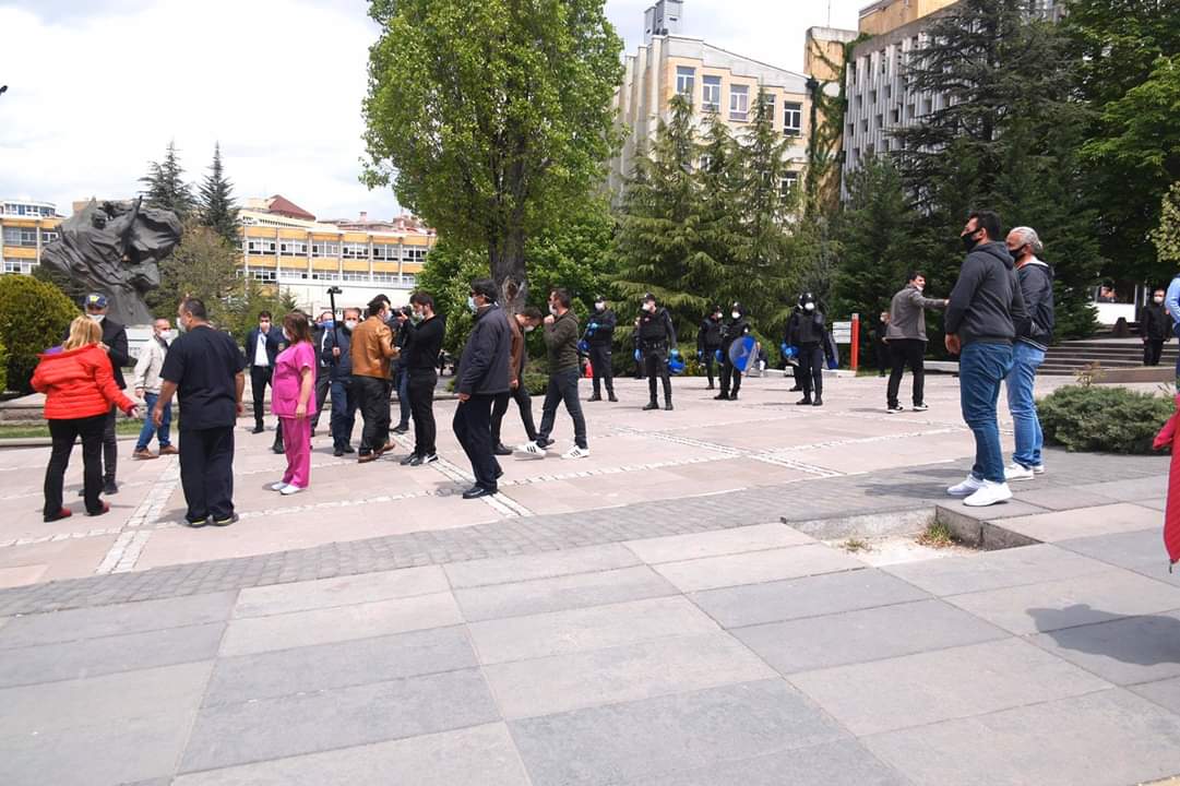 Sağlık çalışanları, valiliğin yasaklama kararına, “Resmi makamından dışarı çıksın, önlük giyip kendisi hastalara müdahale etsin. Bu hastane rektörün hastanesi değil, sağlık çalışanlarının hastanesi. Salgınla mücadele demokrasi ile olur, baskıyla mücadele edemezsiniz. Baskı yaparsanız salgın artar, özgürlük ile mücadele edilir” diyerek tepki gösterdi.