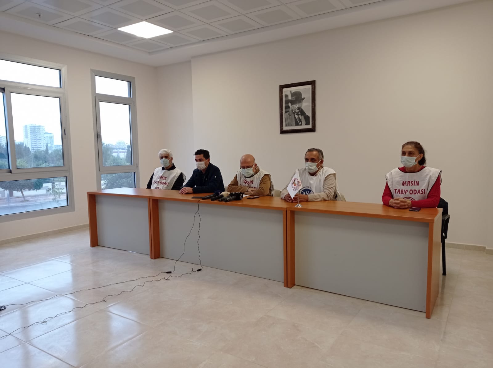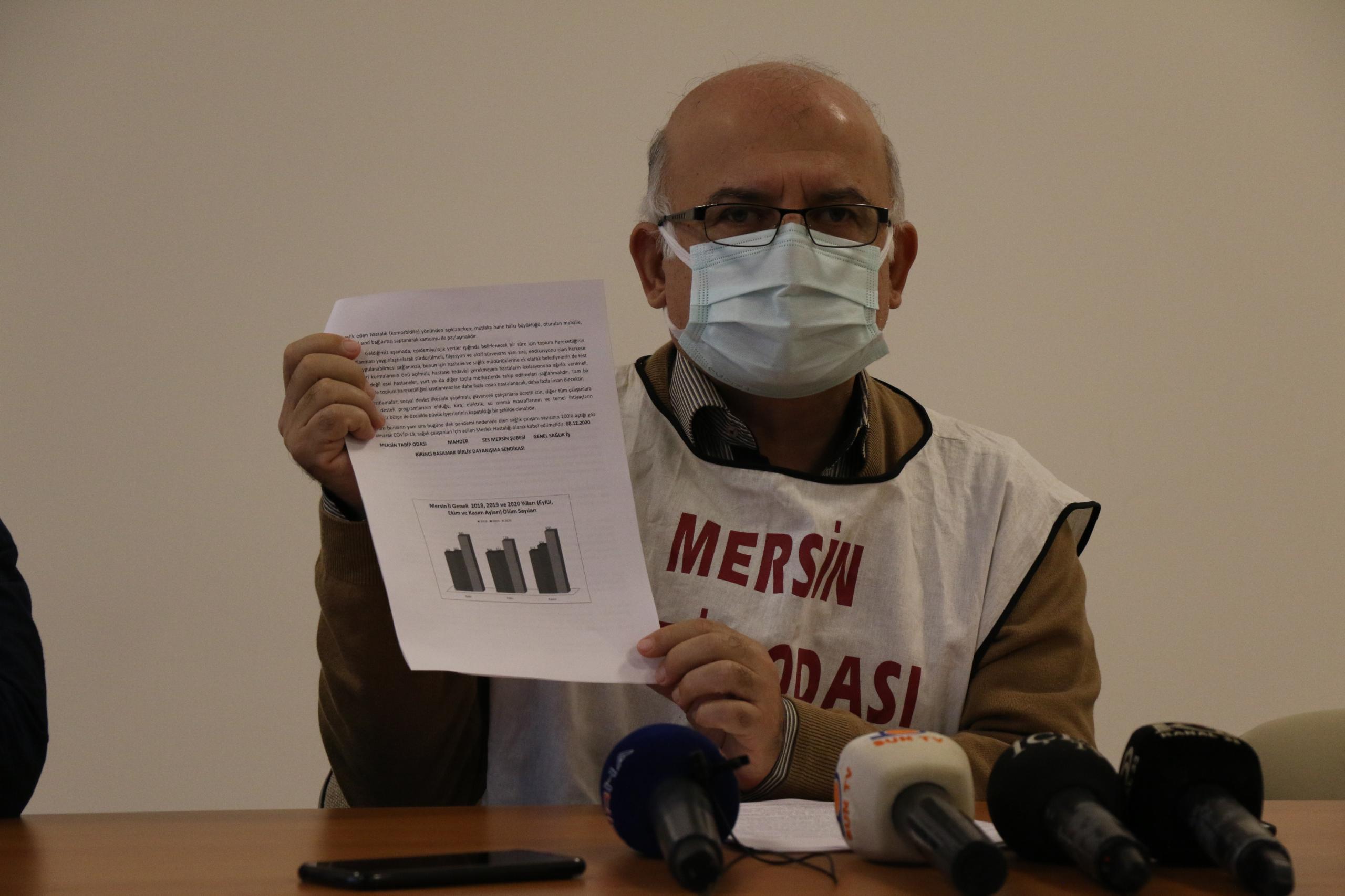 Mersin Tabip Odası, Mersin Aile Hekimleri Derneği (MAHDER), Sağlık ve Sosyal Hizmet Emekçileri Sendikası (SES) Mersin Şubesi, Genel Sağlık İş Mersin Şubesi, Birinci Basamak Birlik ve Dayanışma Sendikası ve Mersin Eczacılar Odası, koronavirüsün Mersin’deki durumuna ilişkin basın toplantısı düzenlendi.