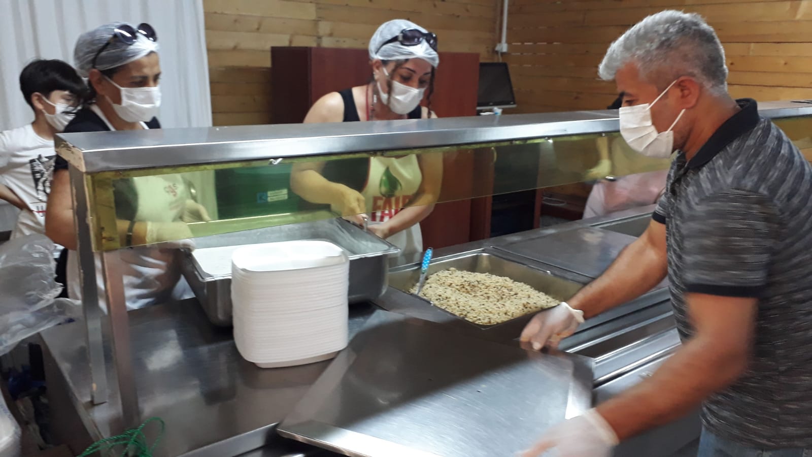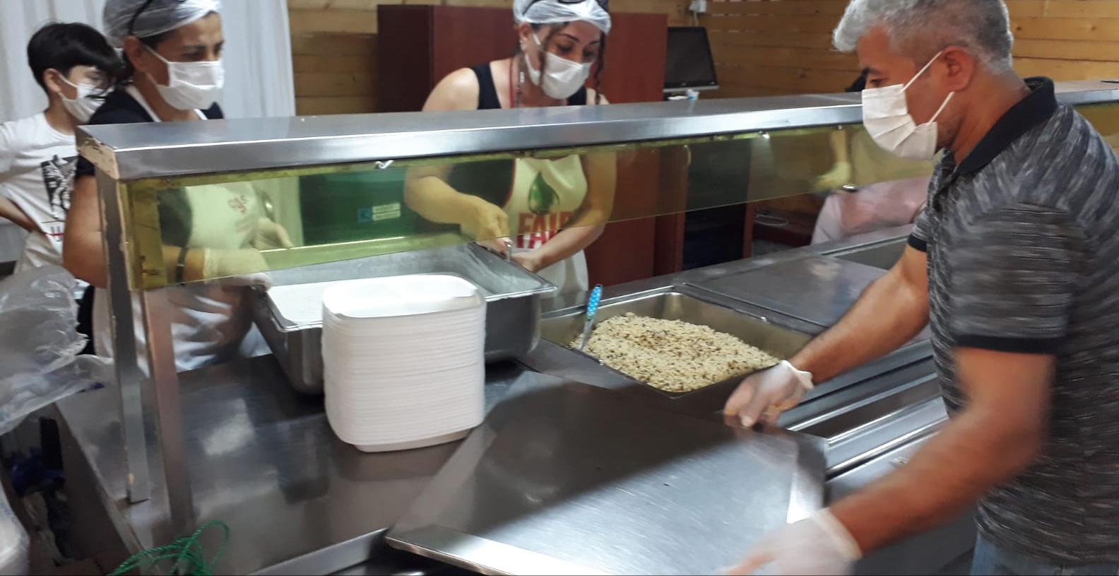 Lokma aşevinde, sağlık tedbirleri kapsamında girişinde herkese kolonya servisi yapılarak, maskesiz girişe izin verilmeyerek paylaşıldı.