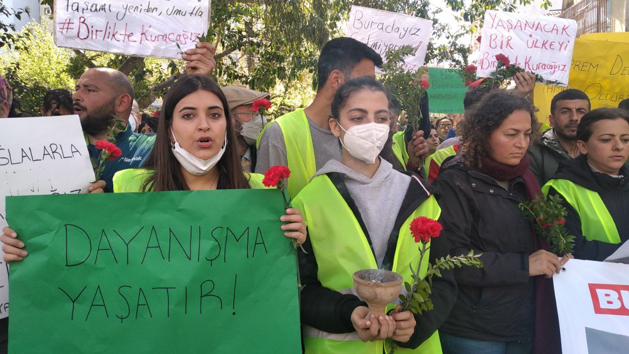 Hatay’ın Samandağ ilçesinde depremde yıkılan evlerin molozlarının Miheyla Kuş Alanı ve stadyumun bitişiğindeki çadır kentin yakınına dökülmesine karşı başlatılan Yaşam Nöbeti sürerken, bir araya gelen yurttaşlar Deprem Dayanışması’nın çağrısıyla, “Gitmiyoruz, molozlara karşı yaşamı savunuyoruz” diyerek yürüyüş yaptı.