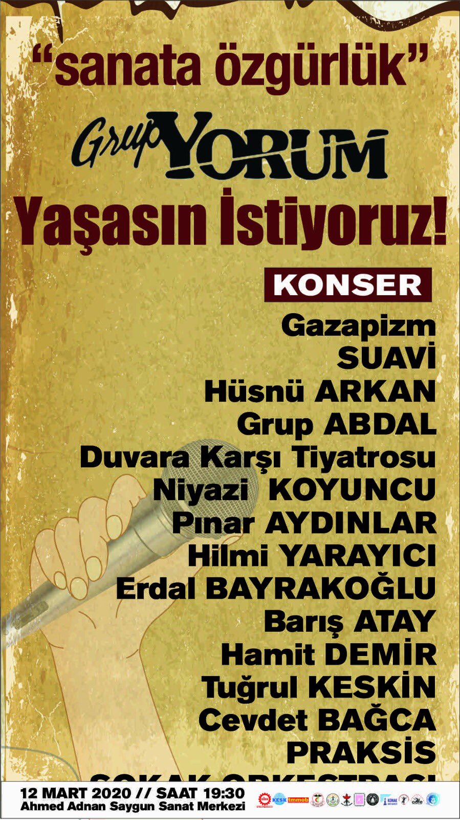 Demokratik kitle örgütleri, baskı ve konser yasaklarının son bulması talebi ile ölüm orucunda olan Grup Yorum üyeleri için çok sayıda sanatçının katılacağı dayanışma konseri, 12 Mart Perşembe günü saat 19.30’da başlayacak.