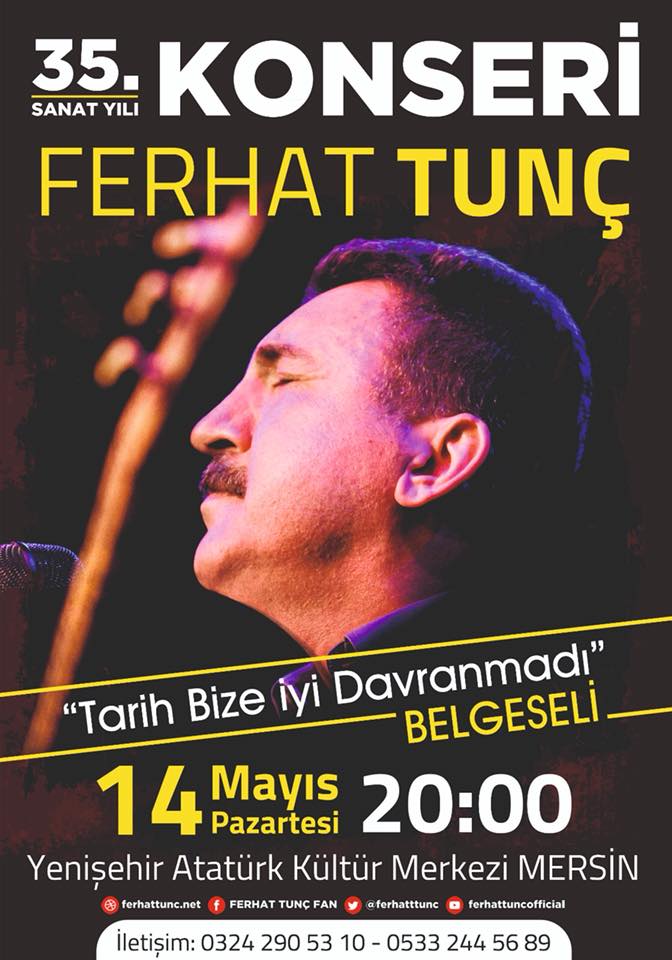 Sanatçı Ferhat Tunç, 35. yılı dolaysıyla düzenlenen Türkiye konserlerinin ilk etabını Adana ve Mersin’de verecek. Mücadeleci kişiliği ve muhalif sanatçı kimliğiyle halkların yüreğinde haklı bir yer edinen Ferhat Tunç, 12 Mayıs Cumartesi günü Adana Seyhan Belediyesi Yaşar Kemal Kültür Merkezi’nde ve 14 Mayıs Pazartesi günü Mersin Yenişehir Atatürk Kültür Merkezi’nde vereceği konserlerle sanat yaşamına dair 35 yıllık hafızayı tazeleyecek. Konserlerde aynı zamanda sanatçının hayatından kesitler sunan ve gazeteci Can Dündar’ın seslendirdiği “Tarih Bize İyi Davranmadı” adlı belgeselde gösterime sunulacak. (HABER MERKEZİ)