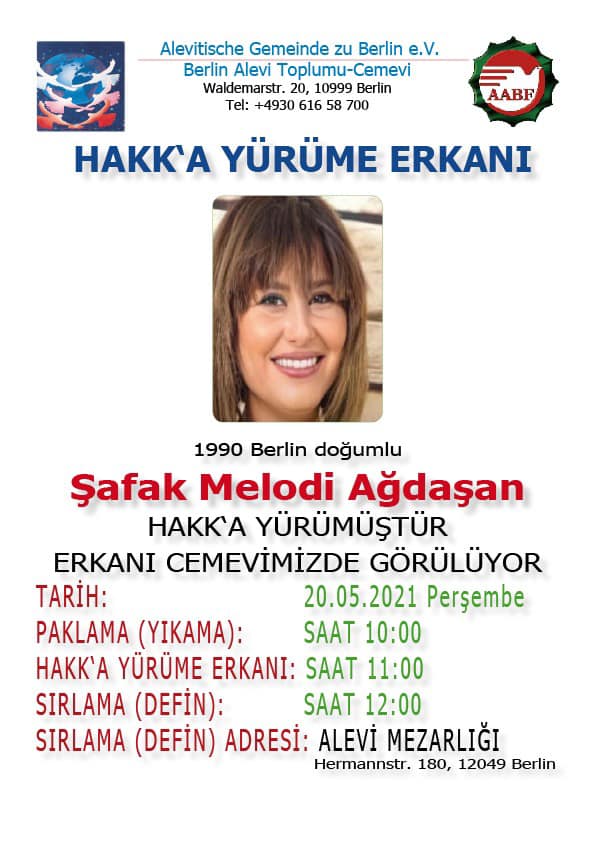 PİRHA- Aşık Şah Turna ve Ozan Şiar’ın kızı sanatçı Şafak Melodi Ağdaşan’ın Hakk’a yürüme erkanı bugün (20 Mayıs 2021) Berlin Alevi Toplumu-Cemevinde, sırlama ise Alevi Mezarlığında yapılacak.