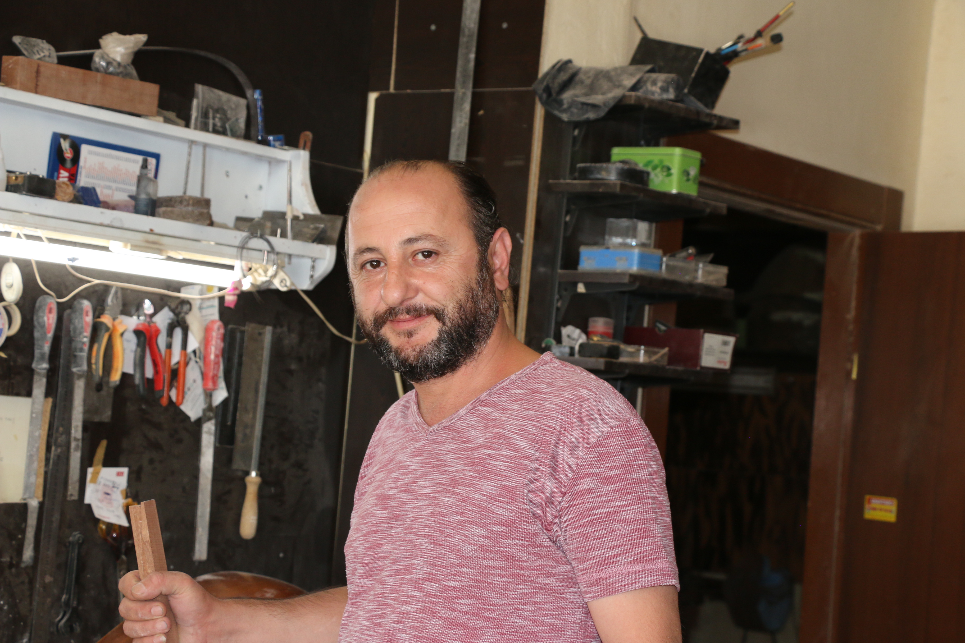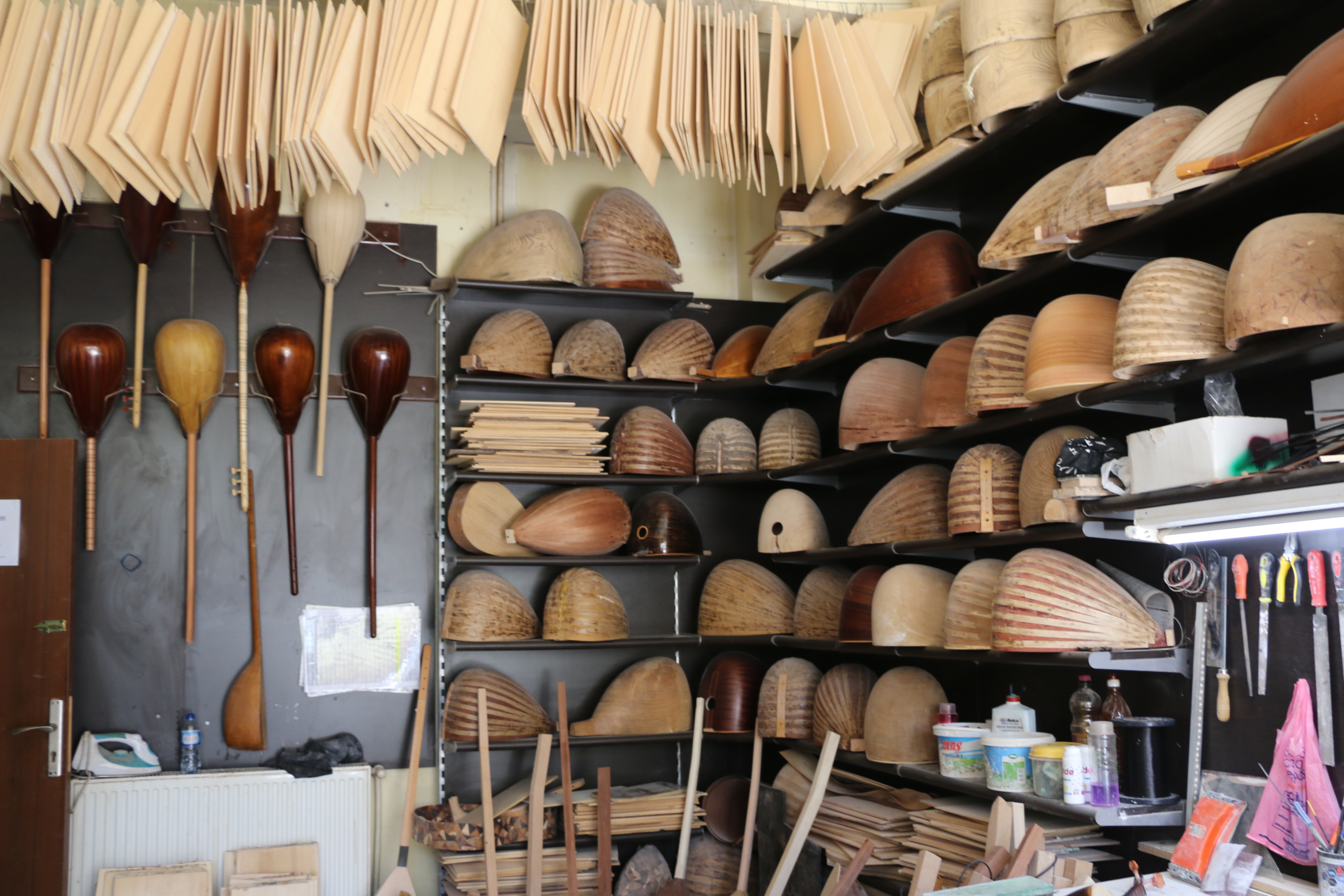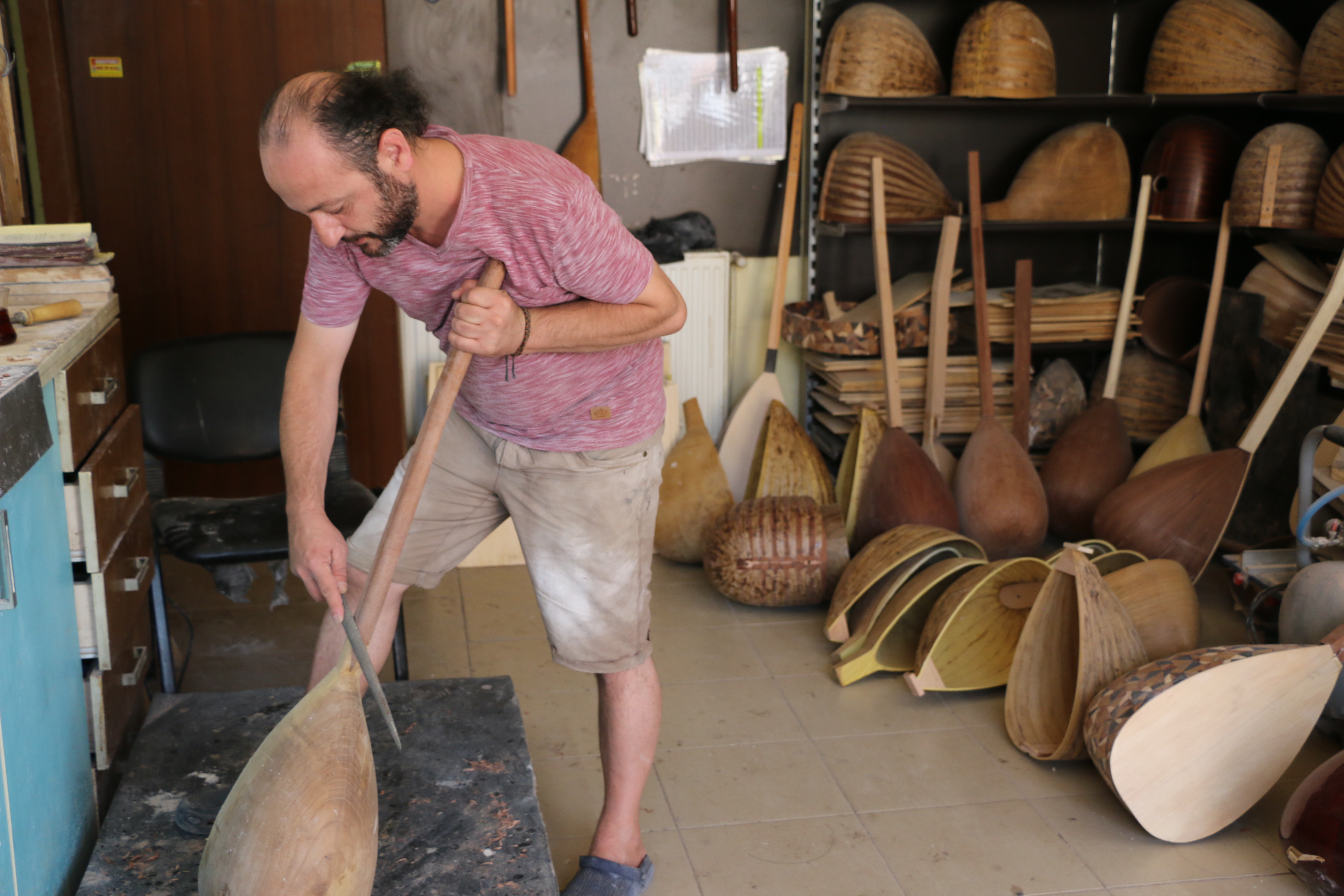 “Oyma tekne tek parça ve içi temiz olduğu için daha iyi ses veriyor. Ama tabi ki bunların hiçbirinde bu tekneden iyi ses çıkar bir şey yok. Ustanın yapması ile şekilleniyor. Her şey kapağa bağlı. Örneğin teknenin yüzde 40 etkisi varsa, kapağın yüzde 60 etkisi var. Tabii iyi bir yapımla. Kapağın, sapın iyi oturtulması, sazın tesviyesi, perdelerin düzgün bağlanması, burguların düzgün açılması bunların hepsi etken. Yaprak tekneleri ağırlıklı İstanbul’dan alıyoruz. Gerek dut gerek kestane olsun oyma tekneler var. Kelebek oyması var. Akça ağaç dediğimiz onları da Samsun’dan alıyoruz. Samsun kültürel anlamda çok uygun bir yer değil ama orada fındık dışında başka yapacak işleri olmadığı için Malatya’dan, Elazığ’dan ağaçlar alıp oyma tekniğini öğrenmişler.”