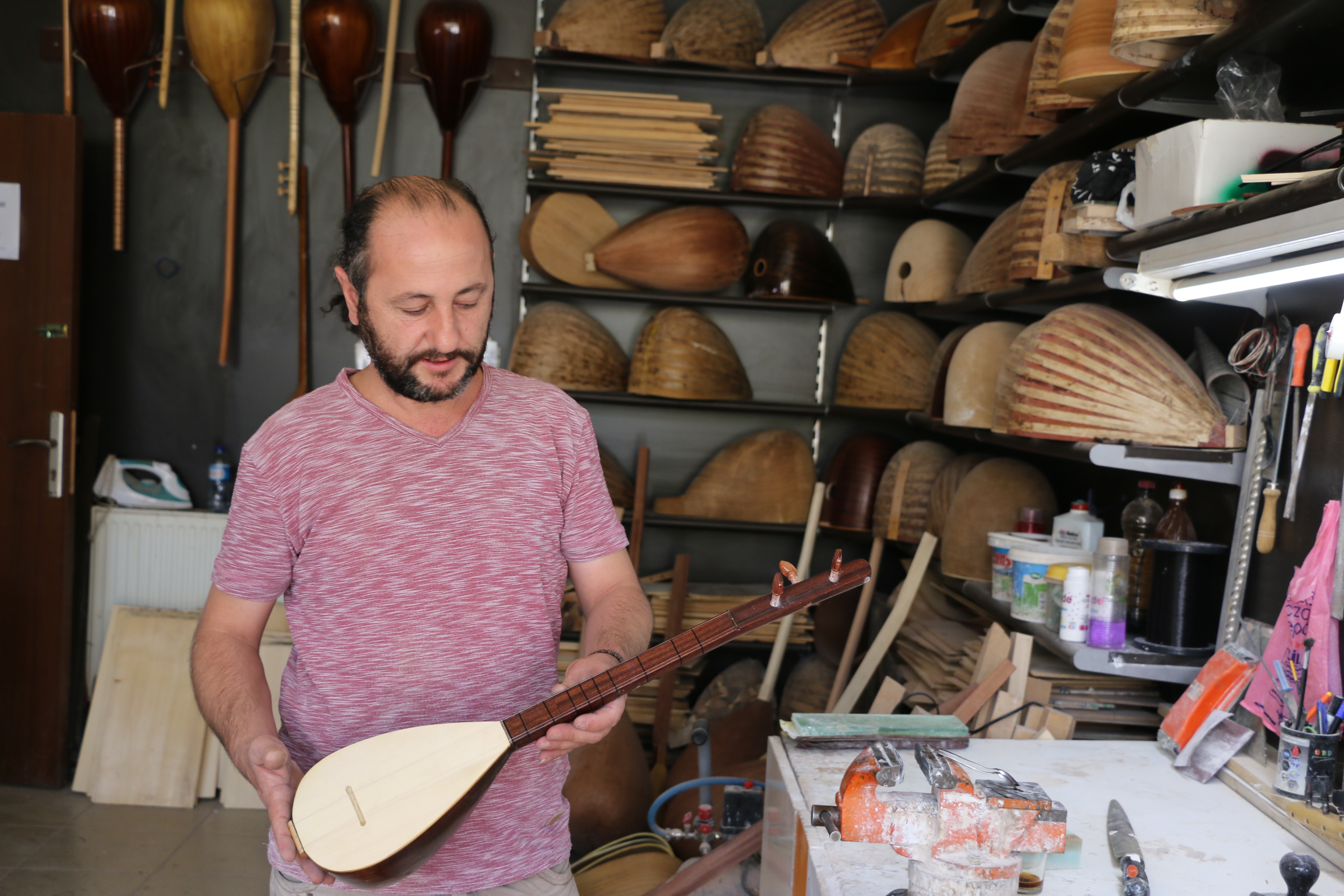 Alevi ve sol yoğunluklu bir bölge olan Tuzluçayır’da sazlarını yapan Erdoğan, oyma teknenin tek parça olduğu için daha iyi ses verdiğini ancak en son halini yine ustanın yapma şeklinin belirlediğini ifade ediyor.