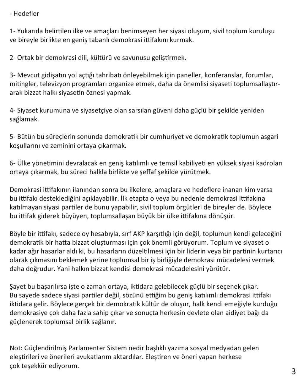 “Ülkemizi, toplumumuzu mevcut durumdan kurtarmak ve düze çıkarmak için geniş tabanlı bir demokrasi ittifakı kurulması gerektiğini düşünüyorum. Bu demokrasi ittifakın’ salt bir seçim ittifakı olarak değerlendirmek doğru olmaz. Asıl amaç, toplumu temel demokrasi ilkeleri ve ortak bir gelecek fikriyatı etrafında bir araya getirmek olmalıdır. Bu toplumsal birlik oluştuktan sonra bunun seçim iş birliğine de katkı sunması elbette beklenir. İşin bu boyutu, daha ziyade seçim dönemine girildiğinde konuşulması gereken bir aşama.