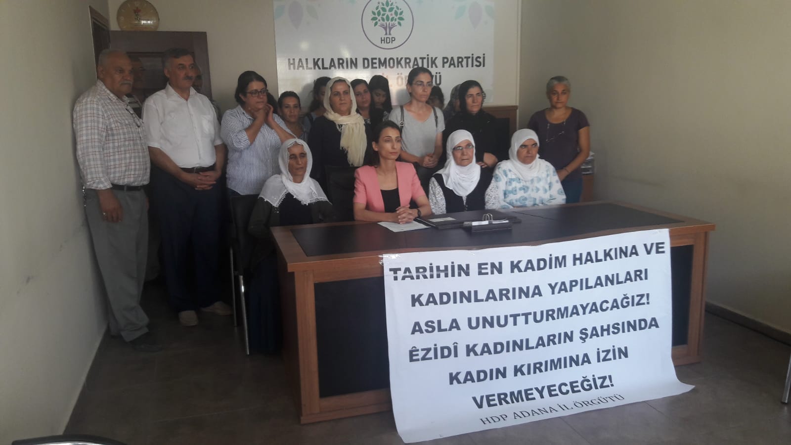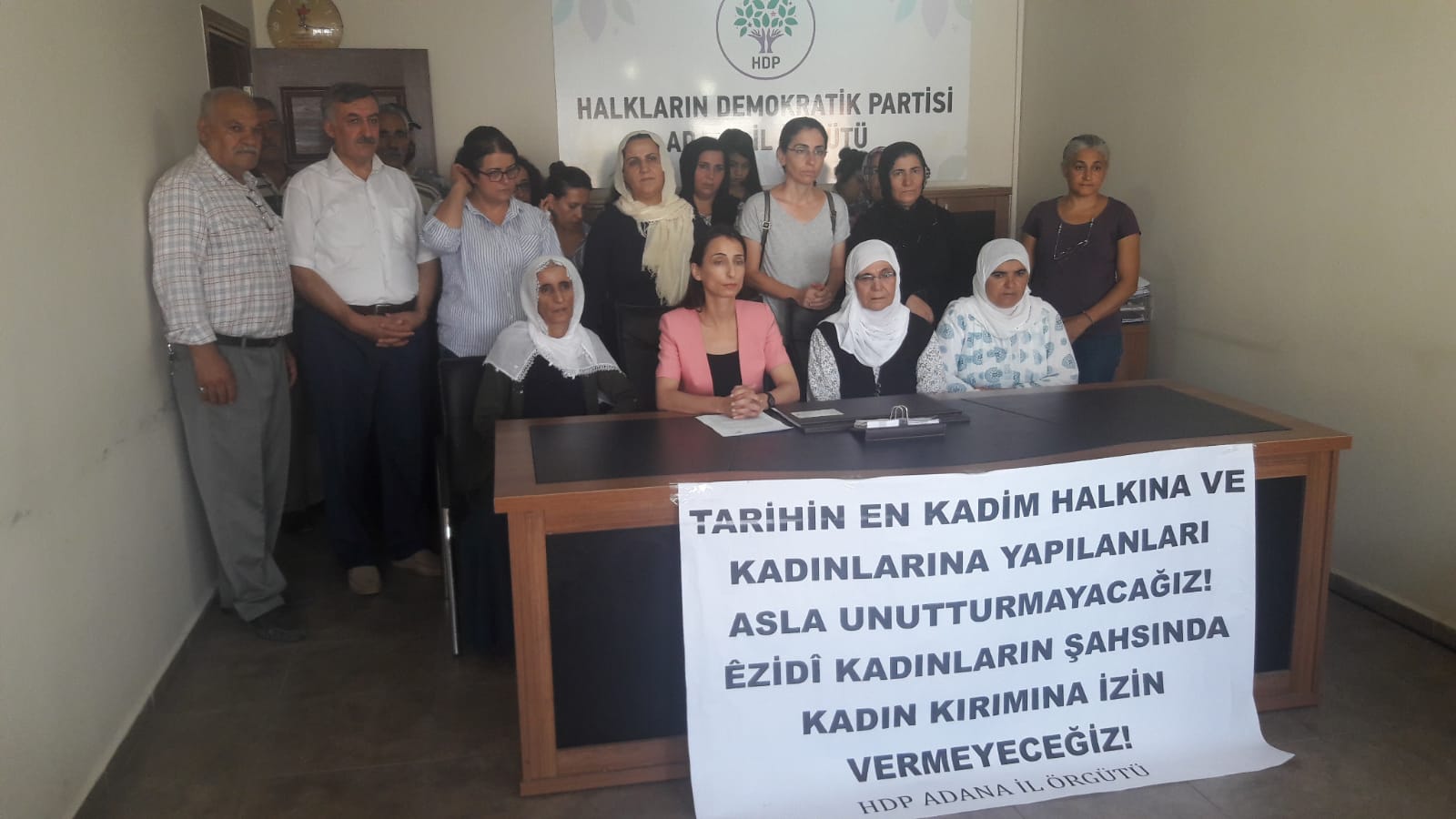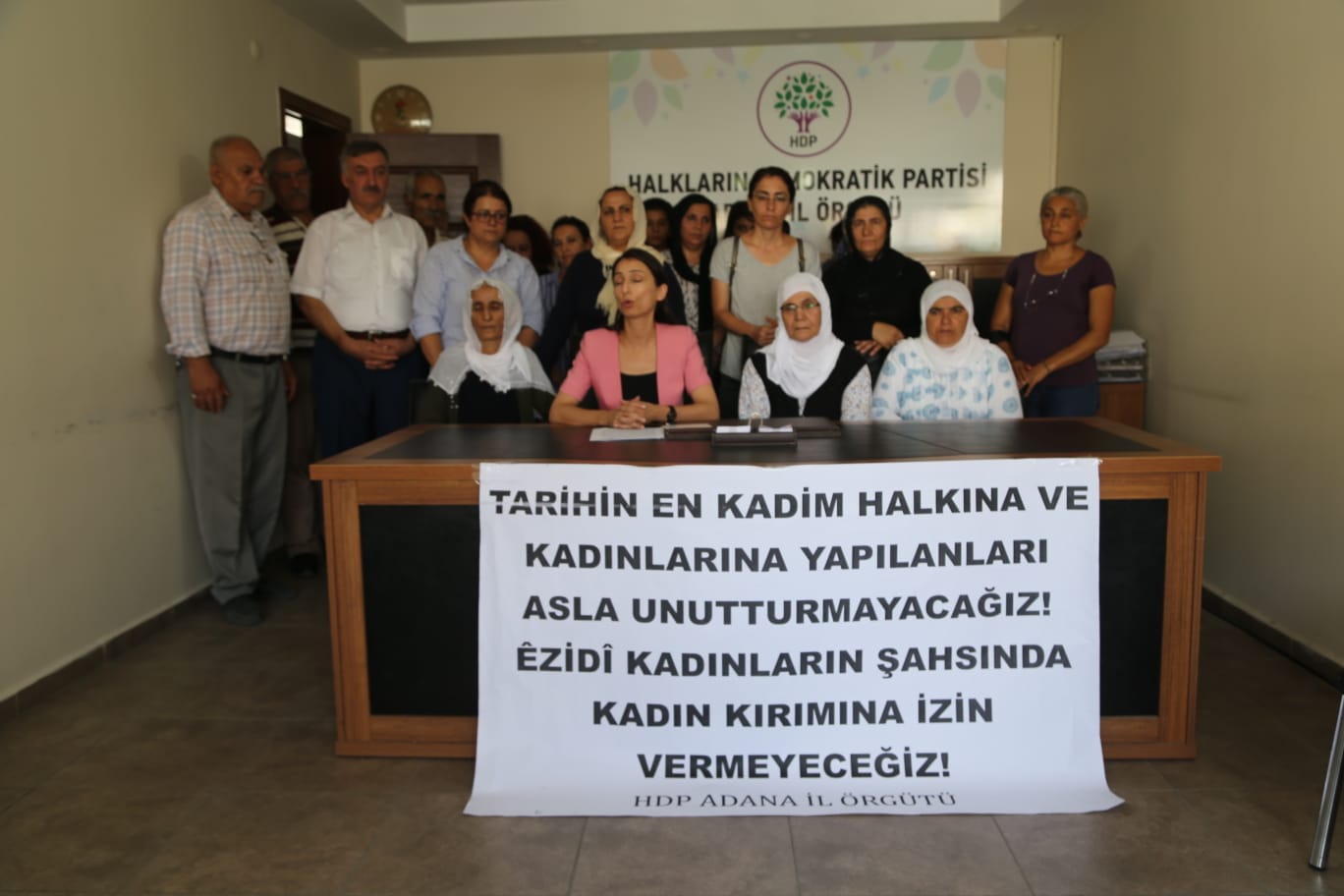 Birçok ilde Şengal Katliamı’nın 4. yılına ilişkin Zorla Alıkonulan Kadınlar İçin Mücadele Platformu basın açıklaması gerçekleştirdi. Adana’da HDP il binasında Şengal Katliamının 4. yıldönümü için bir araya gelen kadınlar adına basın açıklamasını HDP Adana Milletvekili Tülay Hatimoğulları okudu. Hatimoğulları, “İnsanlığın, Srebrenitsa’dan, Arjantin’den, Şili’den, Bolivya’dan, Ermenilerden, Süryanilerden, Halepçe’den, Myanmar’dan, Yemen’den, Kobani’den, Afrin’den, Musul’dan, Raqqa’dan ve Filistin’den bu yana yaşadıklarından beri tarihin hangi sayfasına karanlığı, hangi sayfasına aydınlığı yerleştireceğini korkunç acılar ve büyük bedellerle deneyimlemiş durumdadır” dedi.