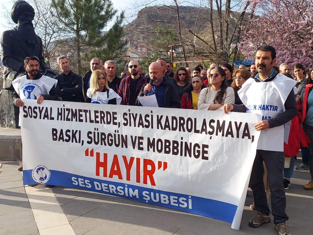 Sağlık ve Sosyal Hizmet Emekçileri Sendikası (SES) Dersim Şubesi, Tunceli Aile ve Sosyal Hizmetler İl Müdürlüğü’nde baskı, mobbing, sürgün, gibi uygulamalar nedeniyle Seyit Rıza Meydanı’nda basın açıklaması yaptı. Açıklamada, ‘Sosyal hizmetlerde siyasi kadrolaşmaya, baskı, sürgün ve mobbinge hayır’ pankartı açıldı.