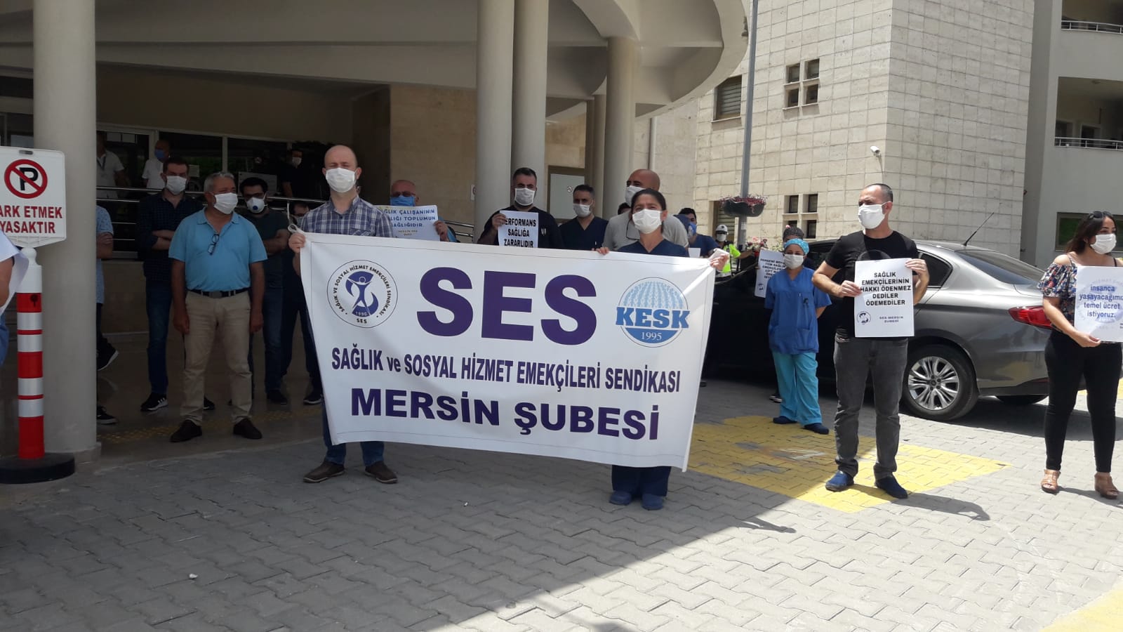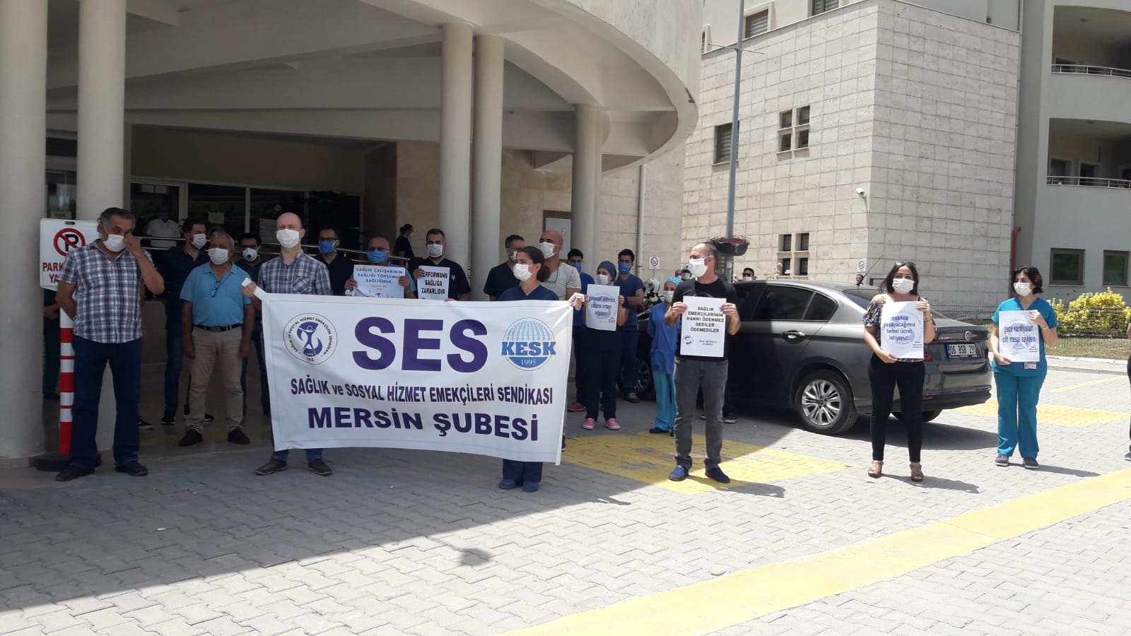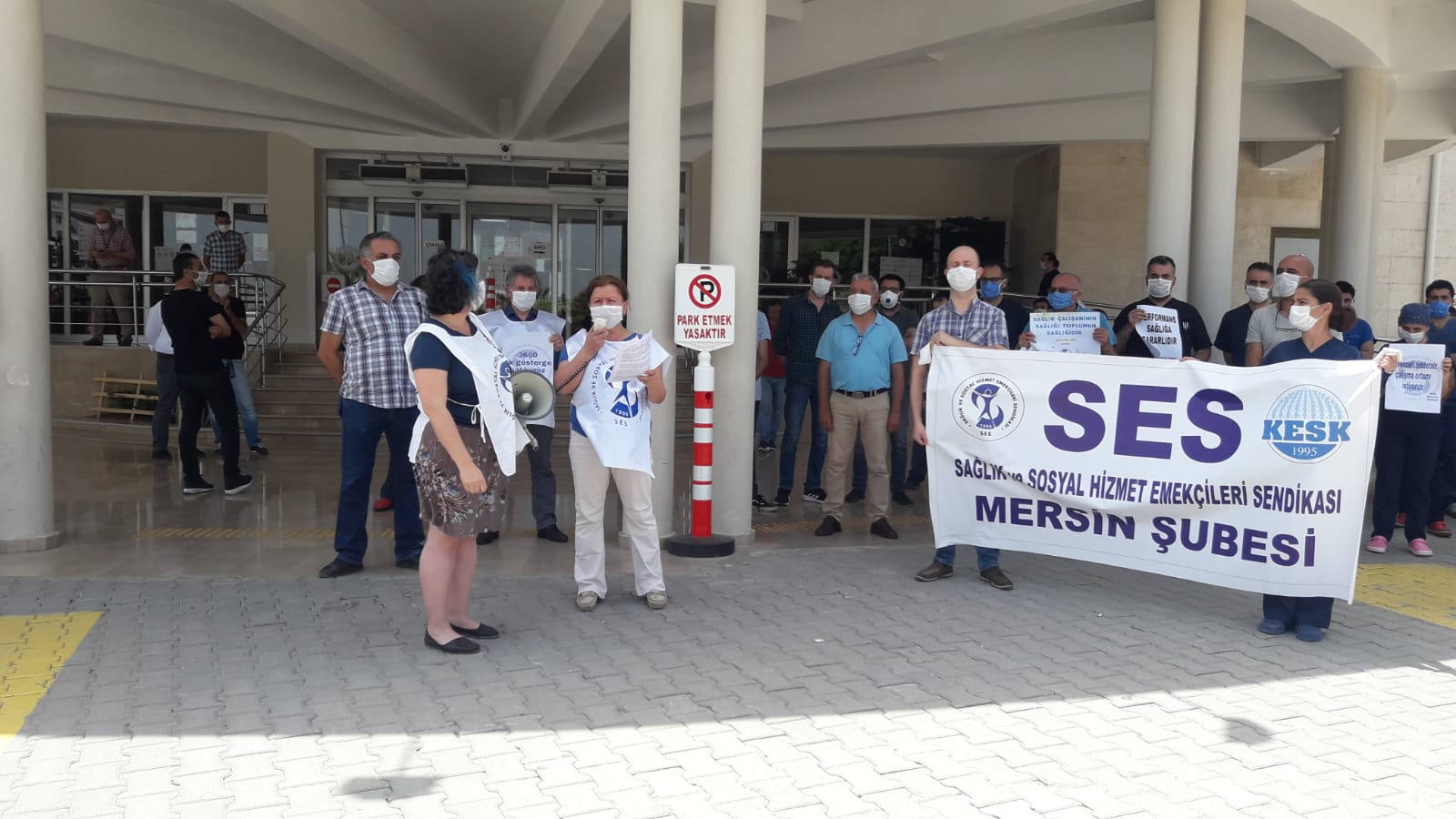Sağlık ve Sosyal Hizmet Emekçileri Sendikası (SES) Mersin Şubesi, Mersin Üniversitesi’nde Poliklinikler binası önünde adil, eşit emekliliğe esas temel ücret, 3600 ek gösterge ve fiili hizmet zammı talebi için, alkışlı protesto eylemi yaptı.