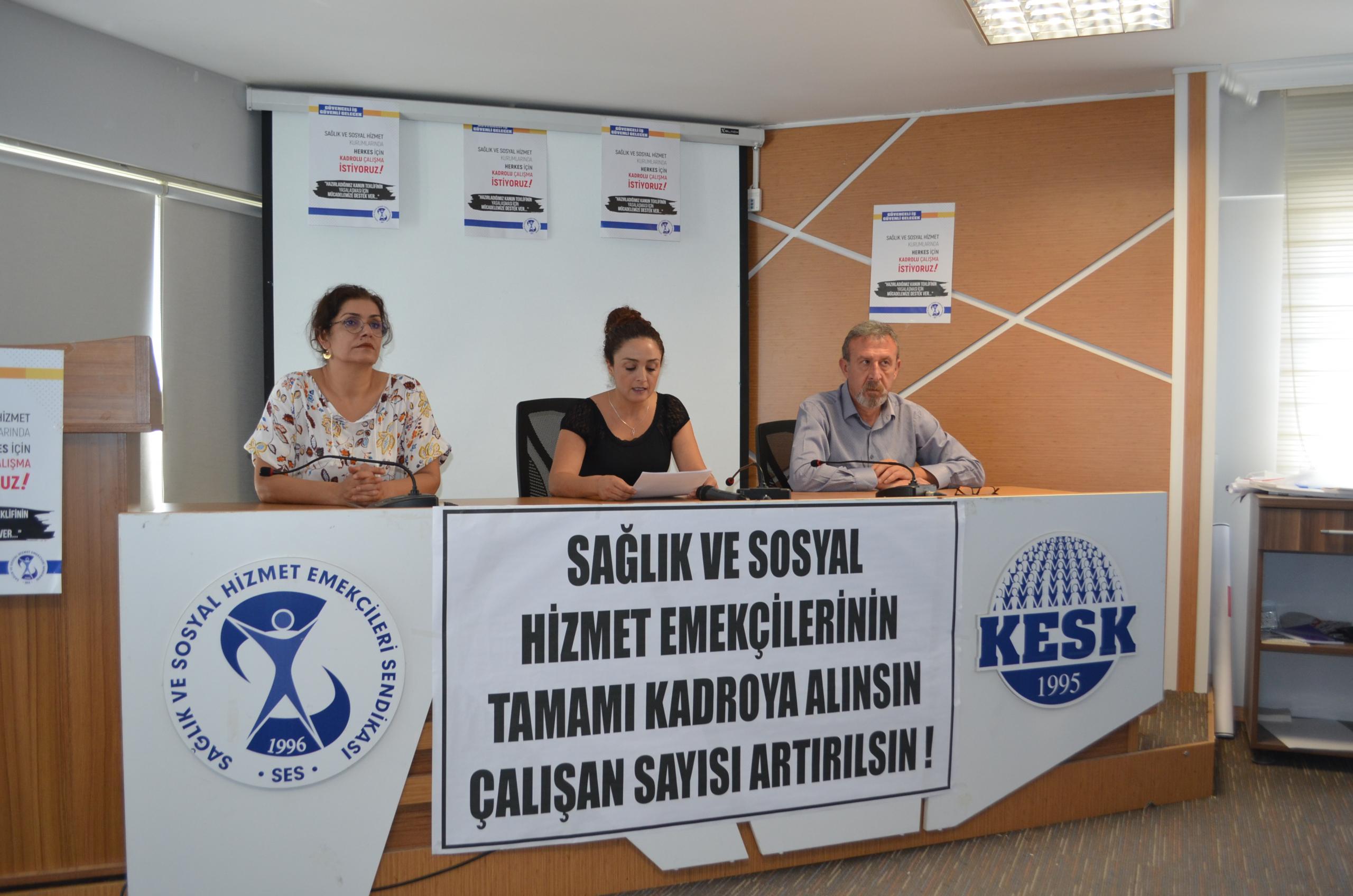 Sağlık ve Sosyal Hizmet Emekçileri Sendikası (SES), “Güvenceli iş güvenli gelecek” adlı kampanyanın startını verdi. “Sağlık ve Sosyal Hizmet Emekçilerinin tamamı kadroya alınsın çalışan sayısı artırılsın” pankartının asılı olduğu sendikanın genel merkezinde düzenlenen basın toplantısını SES Eş Genel Başkanı Gönül Erden, okudu. Pandemi süreciyle birlikte sağlık alanında toplu istifaların arttığına vurgu yapan Erden, “Farklı bahanelerle ataması yapılmayan binlerce sağlık çalışanı var” diyerek, atanamayan sağlık çalışanlarının atanmasını istedi.
