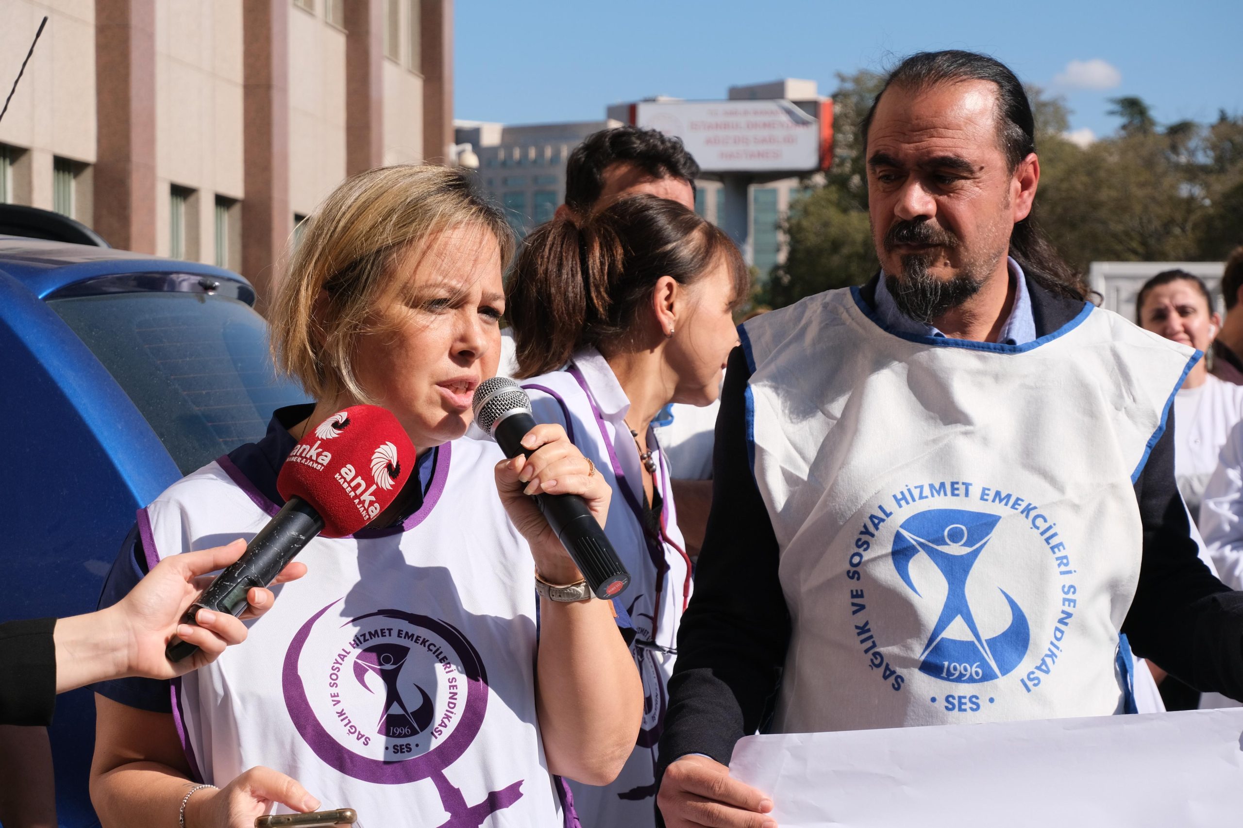 PİRHA-Sağlık ve Sosyal Hizmet Emekçileri Sendikası (SES), İstanbul Okmeydanı Ağız ve Diş Hastanesi önünde gerçekleştirdiği basın açıklamasıyla, 16 Ekim Perşembe günü üç sağlık emekçisine yönelik gerçekleşen saldırıyı protesto etti. Basın metnini SES iş yeri temsilcisi Dt. Hatice Işıl Hatipoğlu okudu.