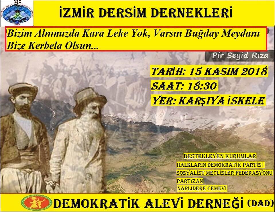 15 Kasım 1937 yılında Elazığ Buğday Meydanı’nda idam edilen Seyit Rıza, oğlu ve yoldaşları için İzmir Dersimliler Derneği ve Demokratik Alevi Derneği İzmir Şubesi ortak bir anma yapacak. Anmaya, Halkların Demokratik Partisi, Sosyalist Meclisler Federasyonu, Partizan ve Narlıdere Cemevi destek verecek. Anma, Saat 18.30’da Karşıyaka İskele’de yapılacak.