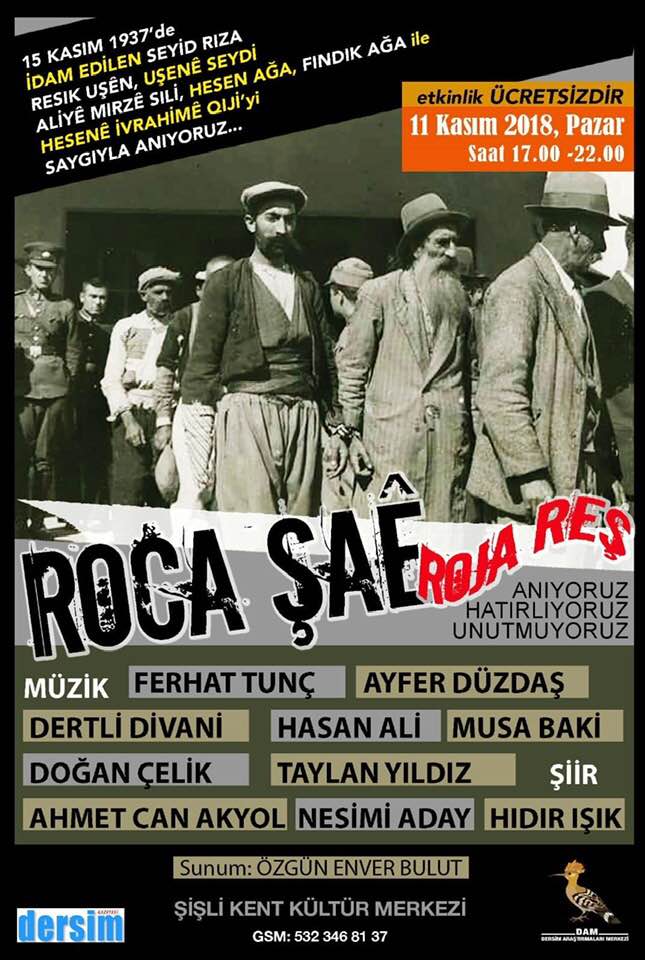 Dersim Araştırmalar Merkezi tarafından düzenlenecek olan etkinlikte müzik dinletisi ve şiirler yer alacak. Etkinlikte sanatçılar Ferhat Tunç, Ayfer Düzdaş, Dertli Divani, Hasan Ali Sezer, Musa Baki, Doğan Çelik, Taylan Yıldız türküler seslendirirken Ahmet Can Akyol, Nesimi Aday ve Hıdır Işık da şiirler seslendirecekler.