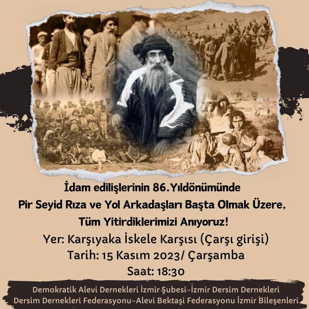 15 Kasım 1937 yılında Elazığ Buğday Meydanı’nda idam edilen Seyit Rıza, oğlu ve yoldaşları için İzmir Dersim Dernekleri, Demokratik Alevi Dernekleri İzmir Şubesi, Dersim Dernekleri Federasyonu ve Alevi Bektaşi Federasyonu İzmir Bileşenleri öncülüğünde anma gerçekleşecek.