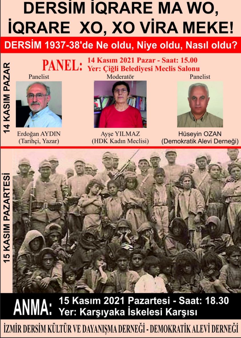 14 Kasım tarihinde Çiğli Belediyesi Meclis Salonu’nda yapılacak ‘Dersim 1937-38’de Ne Oldu, Niye Oldu, Nasıl Oldu’ konulu panele Araştırmacı-Yazar Erdoğan Aydın ve Demokratik Alevi Dernekleri (DAD) Genel Merkez Eğitim Sekreteri Hüseyin Ozan konuşmacı olarak katılacaklar. Panel, saat 15.00’te başlayacak.