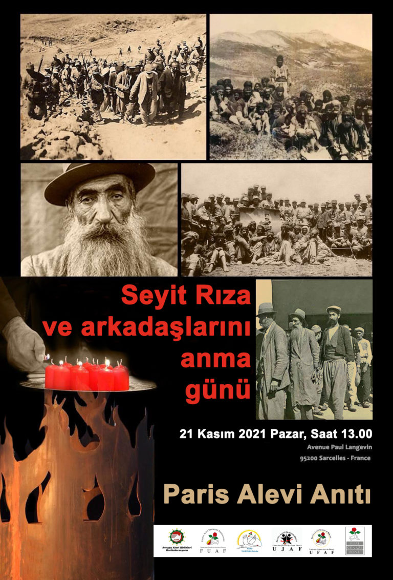 15 Kasım 1937 yılında Elazığ Buğday Meydanı’nda idam edilen Seyit Rıza, oğlu ve yoldaşları için Fransa Alevi Birlikleri Federasyonu öncülüğünde Paris Alevi Anıtı önünde anma gerçekleştirilecek. Anma 21 Kasım Pazar günü saat 13.00’te başlayacak.