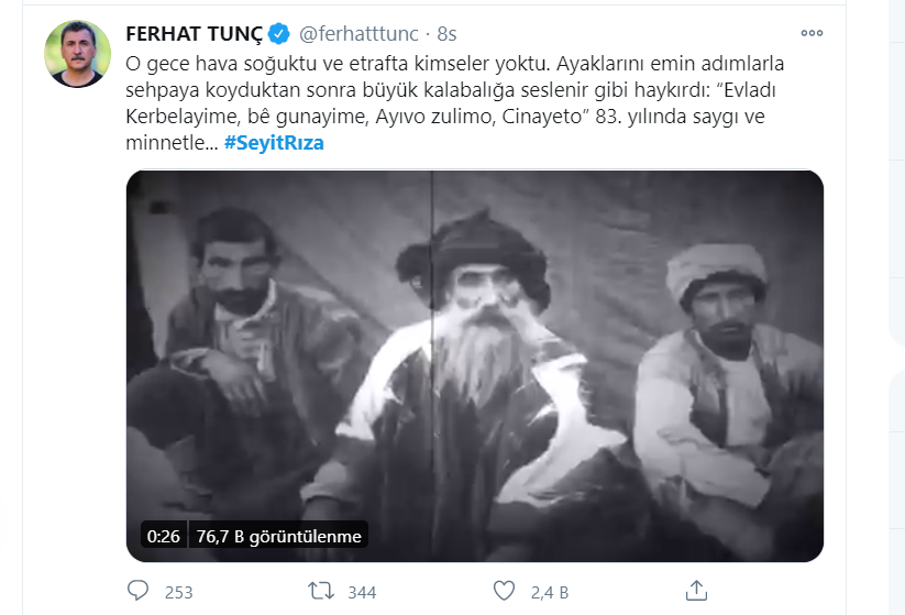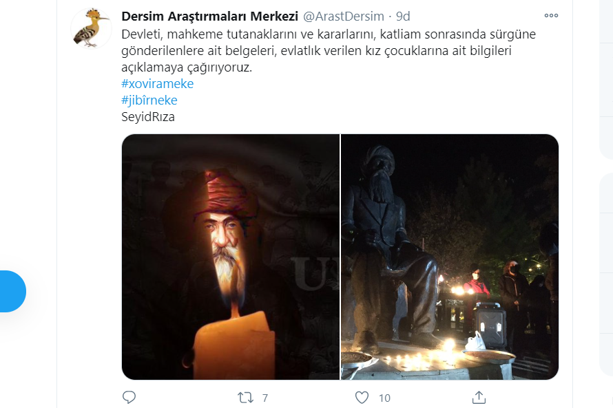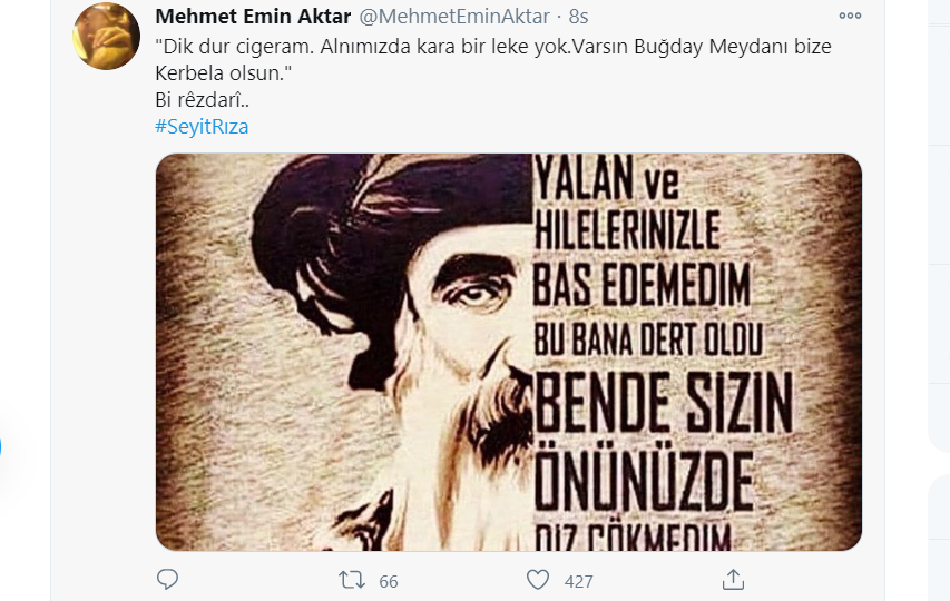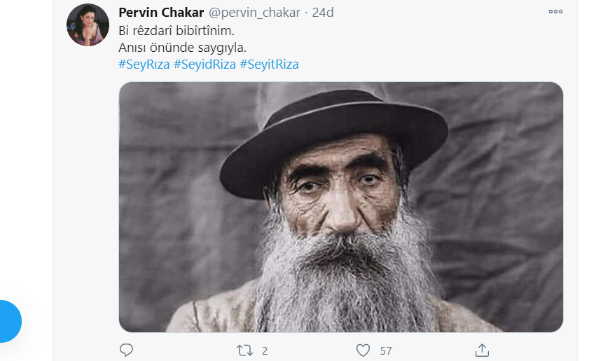 PİRHA- Alevi kurum temsilcileri, sanatçıların yanı sıra binlerce yurttaş anma mesajlarını sosyal medyada #SeyidRıza hastag’iyle paylaşarak, Seyit Rıza ve arkadaşlarının mezar yerlerinin açıklanmasını ve soykırımla yüzleşilmesini talep etti.
