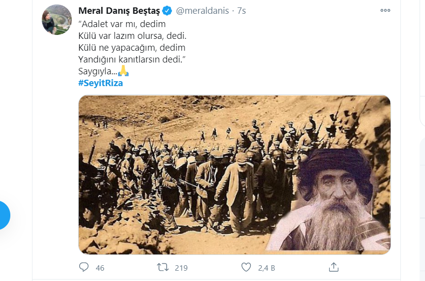 #SeyidRıza hastag’iyle yapılan paylaşımlarda Seyit Rıza ve arkadaşlarının mezar yerlerinin açıklanması ve soykırımla yüzleşilmesi talep edildi.