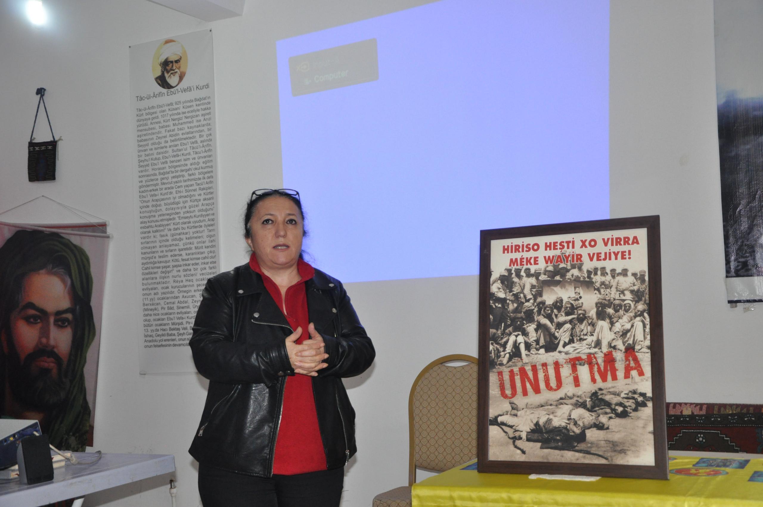 Konuşmalar ardından Dersim Katliamı ile ilgili sinevizyon yapıldı. Sonrasında söz alan Gazeteci Hatice Çevik, “Dersim bölgesi inanç merkezi olmakla birlikte sarp kayalıklardan oluşan sayısız mağaraların olduğu bir bölgedir. Dersim halkı direniyor. Hala özüne sahip olmaya çalışıyor. Bu nedenle seyitlerine daha fazla sahip çıkıyorlar. İnsanlar artık yaşlanıyor, yaşanan katliama tanıklık edenler bir bir ortadan kalkıyor. Buradan yola çıkarak araştırmacılarımız, yazar, gazeteci canlarımız tanıklar üzerinden kültürel araştırmalar yaparak bir arşiv oluşturmaya çalışıyorlar” dedi.
