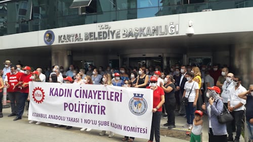 Kadın cinayetleri ve kadına yönelik şiddet artarken, İstanbul Sözleşmesi’nden çekilmenin gündeme gelmesi üzerine tepkiler devam ediyor. Kadın örgütlerinin eylemleri sürerken DİSK’e bağlı Genel İş Sendikası Anadolu Yakası 1 Nolu Şube üyeleri Kartal Belediyesi önünde “Kadına Şiddeti Durdur İstanbul Sözleşmesini Uygula” şiarıyla basın açıklaması gerçekleştirdi.