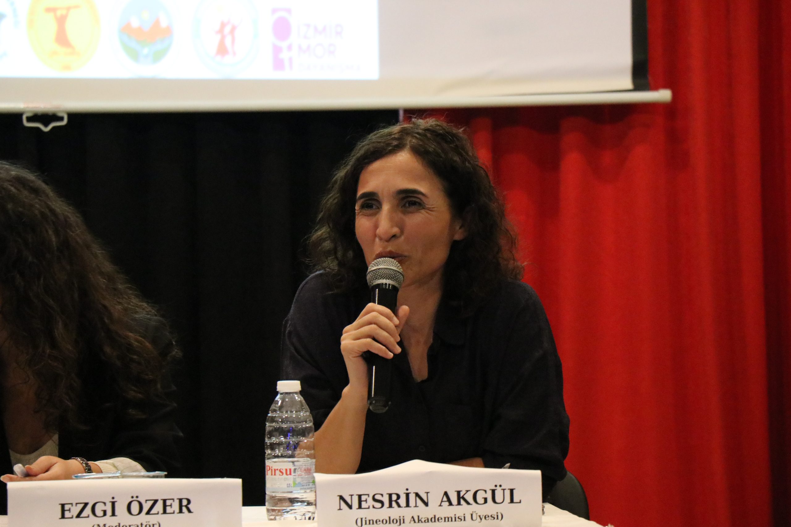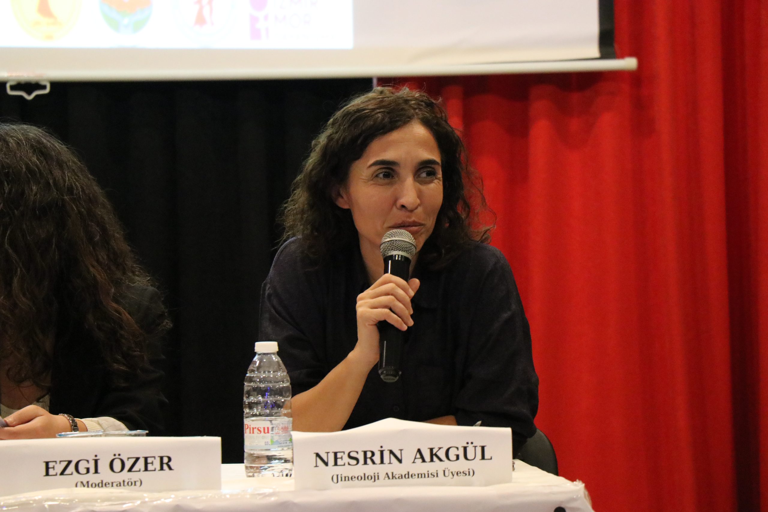 Panelde ilk olarak Nesrin Akgül söz aldı. Nesrin Akgül, şiddetin normalleşme tehlikesi olduğuna vurug yaparak, “Biz demokratik toplum inşasında yer almak istiyoruz ve barışın diyen bir toplumsal dinamik var. Madem bunun istemindeyiz o zaman bugün daha fazla kadına yönelik şiddette ne yapılması gerektiğini, bunun bakış açısını daha fazla tartışmalıyız. Günlük olarak şiddet beyan ediliyorken bunun normalleşme tehlikesi var. bu kadar şiddete çözüm üretmemek normalleşme tehlikesi yaratır. Bizim ahlaki reflekslerini öldürü. Reya hak her şeyden önce vicdan der. Rızalık üretirken her bir canı can olarak kabul eder biz de her yaşanan oalya karşı vicdani ses olmak zorundayız. Kadına şiddete alışmamak için buna tepki koyacağız” diye konuştu.