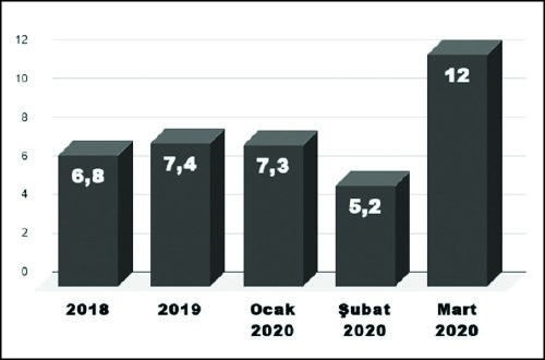 Muhasebat Genel Müdürlüğü’nün verilerine göre mart ayında 36,9 milyar liralık vergi tahsilatı yapıldı. Bu kalemden toplanan vergi tahsilatı mart ayında 4,4 milyar lirayı buldu. Mart ayı itibariyle toplam vergi tahsilatının yüzde 12’sine denk gelen tutar böylece tütün ürünlerinden tahsil edilen ÖTV oldu. Buna karşılık 2019’da bu oran yüzde 7,4, 2018’de ise yüzde 6,8’di. Bu yılın ocak, şubat ve mart aylarındaki oran ise grafikteki gibi.