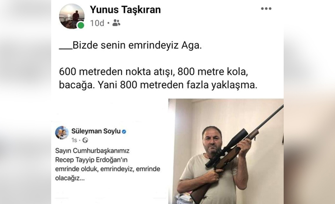 Bu açıklamanın ardından Muğla Fethiye’de bulunan Melsa Mesleki ve Teknik Anadolu Lisesi Din Kültürü ve Ahlak Bilgisi öğretmeni olduğu öğrenilen Yunus Taşkıran Süleyman Soylu’nun Erdoğan’a teşekkür mesajına atıfta bulunarak, silahla çekilmiş fotoğrafını paylaştı. Yaptığı silahlı paylaşımın üzerine, ‘Biz de senin emrindeyiz Ağa. 600 Metreden nokta atışı, 800 metre kola bacağa, yani 800 metreden fazla yaklaşma’ şeklinde not yazmıştı.