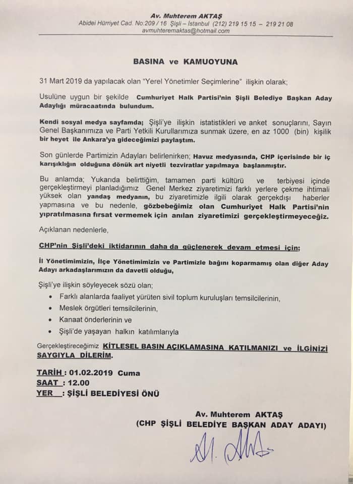 Aktaş’ın açıklamasında “CHP’nin Şişli’deki iktidarının daha da güçlenerek devam etmesi için; İl Yönetimimizin, İlçe Yönetimimizin ve Partimizle bağını koparmamış olan diğer Aday Adayı arkadaşlarımızın da davetli olduğu, Şişli’ye ilişkin söyleyecek sözü olan; farklı alanlarda faaliyet yürüten sivil toplum kuruluşları temsilcilerinin, meslek örgütleri temsilcilerinin, kanaat önderlerinin ve Şişli’de yaşayan halkın katılımlarıyla gerçekleştireceğimiz kitlesel basın açıklamasına katılmanızı diliyoruz” ifadeleri yer aldı.