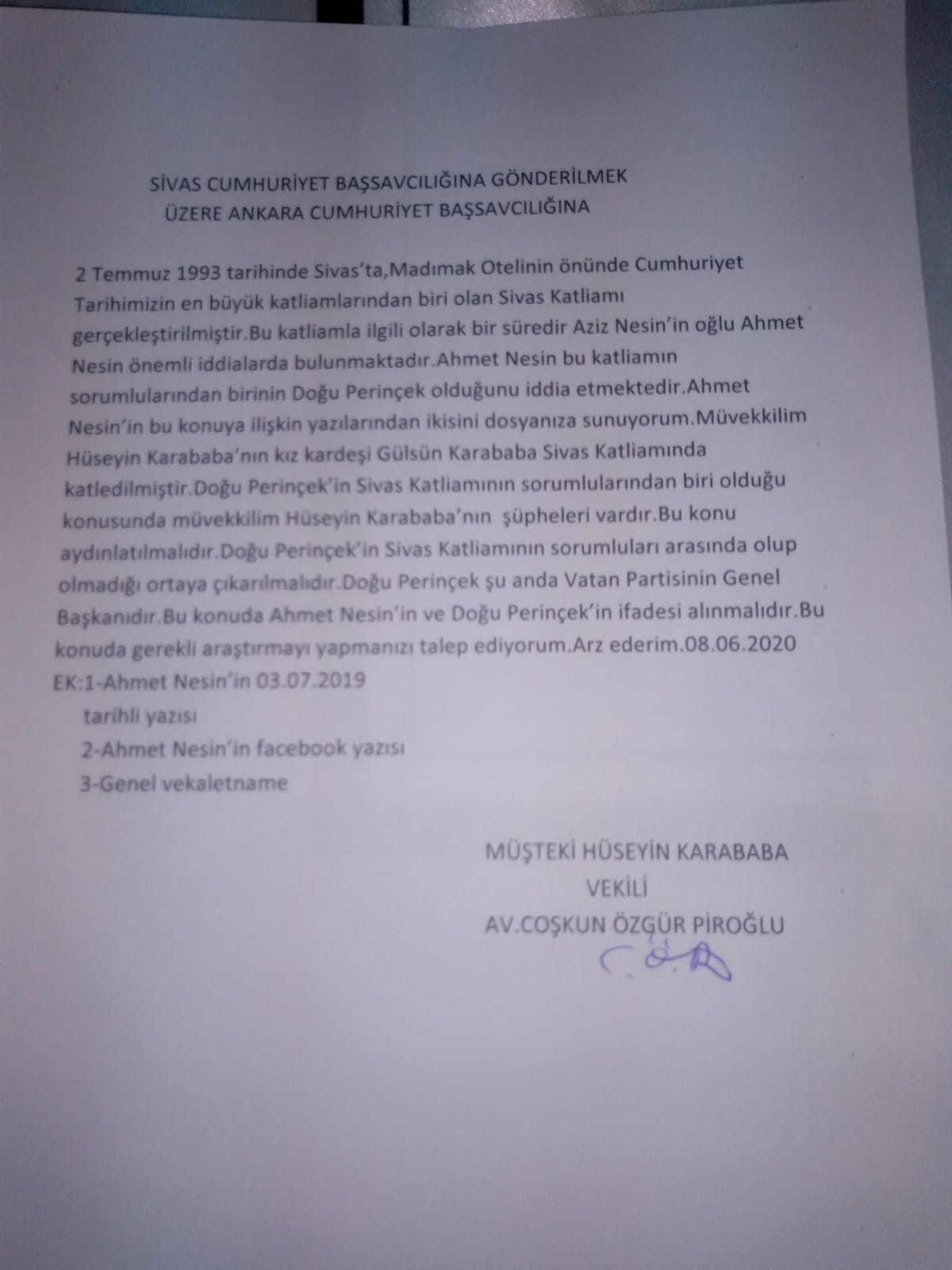 Avukat Piroğlu, Ahmet Nesin’in söz konusu yazı ve sosyal medya paylaşımlarını sunduğu başvuruda, “Doğu Perinçek’in Sivas Katliamı’nın sorumlularından biri olduğu konusunda müvekkilim Hüseyin Karababa’nın şüpheleri vardır. Bu konu aydınlatılmalıdır. Doğu Perinçek’in Sivas Katliamı’nın sorumluları arasında olup olmadığı ortaya çıkarılmalıdır. Doğu Perinçek şu anda Vatan Partisi’nin Genel Başkanıdır. Bu konuda Ahmet Nesin ve Doğu Perinçek’in ifadesi alınmalıdır” dedi.