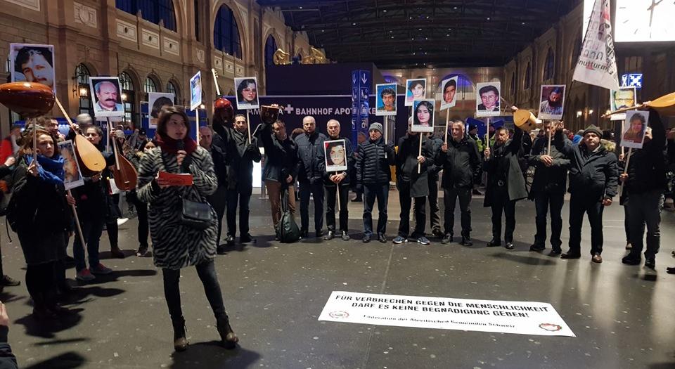 İsviçre Alevi Birlikleri Federasyonu’na bağlı derneklerin organize ettiği protesto eylemi, Zürih Merkez Tren Garı’nda yapıldı. Kalabalık bir kitlenin katıldığı eyleme İsviçrelilerin de yoğun ilgi gösterdiği gözlemlendi.