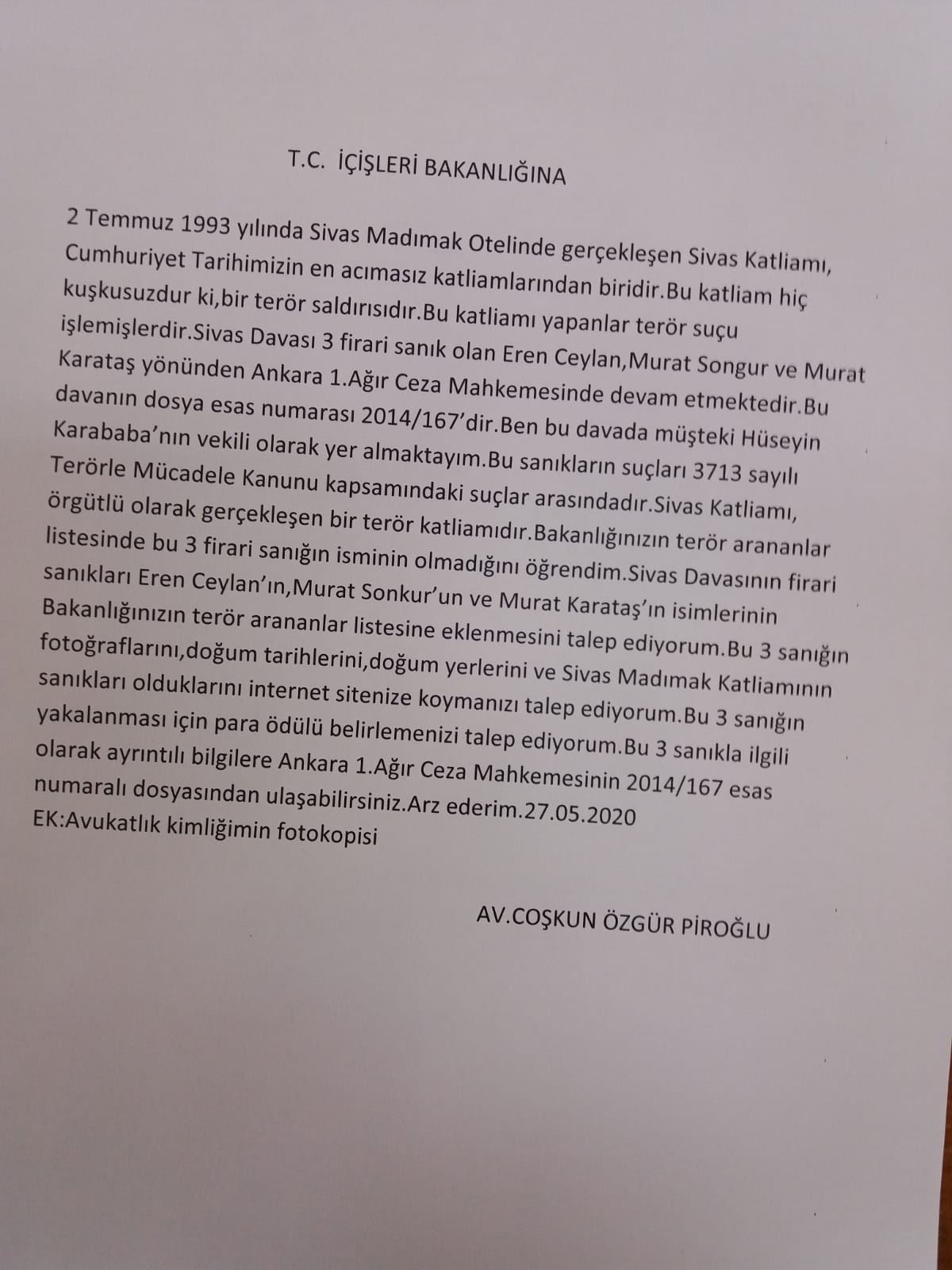 Sivas Katliam davasının 3 firari sanığı Eren Ceylan, Murat Songur ve Murat Karataş’ın yargılanması sürerken, sanıkların İçişleri Bakanlığının terör arananlar listesine alınması için katliamda hayatını kaybeden Gülsüm Karababa’nın abisi Hüseyin Karababa’nın avukatı Coşkun Özgür Piroğlu, İçişleri Bakanlığına başvuruda bulundu.