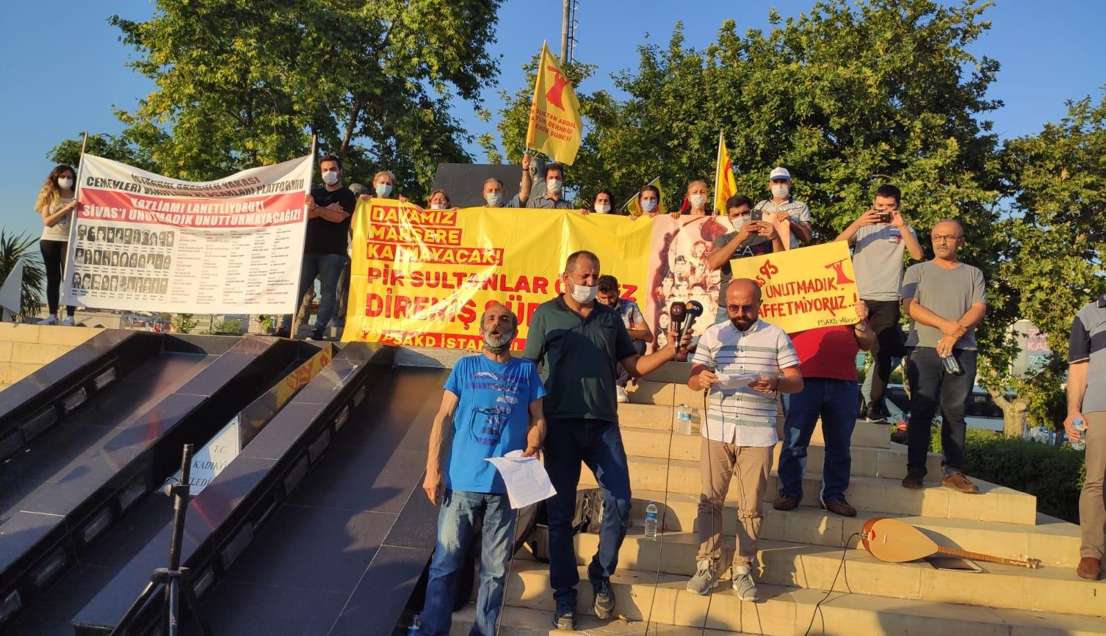 Yoğun katılımın olduğu açıklamayı PSAKD Ataşehir Başkanı Gülsev Kaya okudu. ‘Sivas için adalet herkes için adalet’ başlığıyla yapılan açıklamada 27 yıl önce Pir Sultan’ı anma etkinliklerine giden 33 canın devlet güçlerinin gözü önünde karanlık zihniyetli, gerici, nefret dolu, barbar, şeriatçı bir güruh tarafından katledildiği belirtildi.