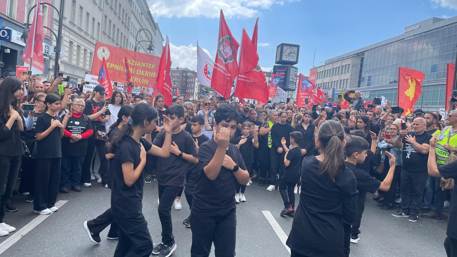 Berlin Hermannplatz’da başlayan yürüyüş yaşamını yitiren canlar adına bir dakikalık saygı duruşu ve AABF İnanç Kurulu Başkanı Celal Keykubat’ın okuduğu gülbeng ile başladı.