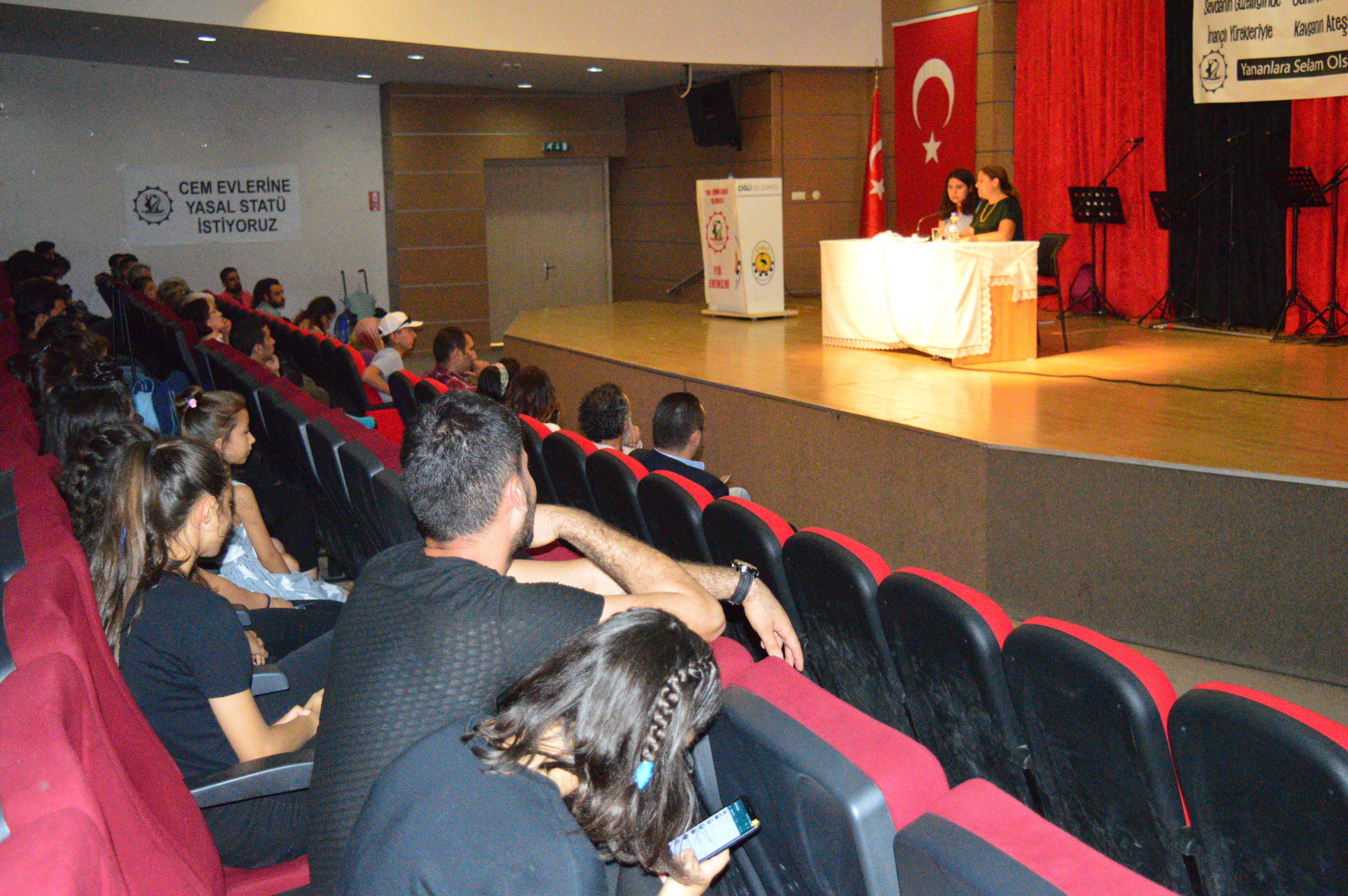 İzmir’de Yol Erenleri, Sivas Katliamı’nın 26. yılında anma etkinliği düzenledi. Anmanın düzenlendiği salona “Cemevlerine yasal statü istiyoruz”, “Eşit yurttaşlık için demokratik anayasa!”, “Sevdanın güzelliğinde canın cana hasretinde inançlı yürekleriyle kavganın ateşlerinde yananlara selam olsun” yazılı dövizler asıldı.
