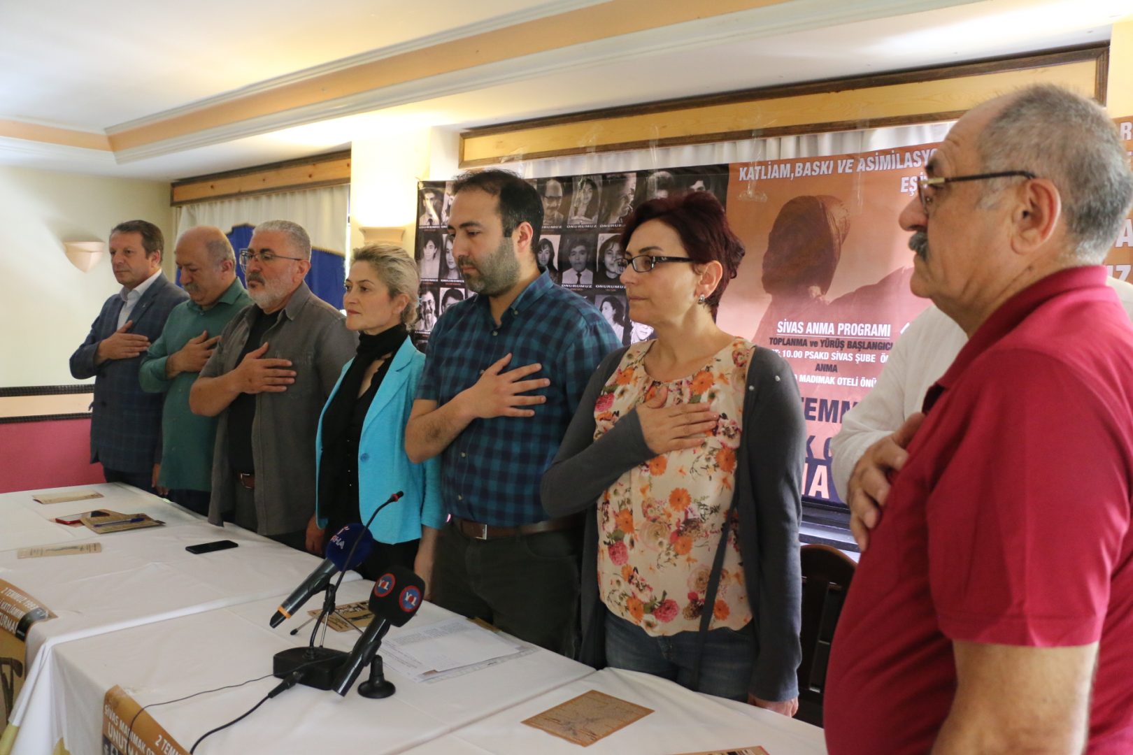 PSAKD Genel Sekreteri Onur Şahin, Sivas şehitleri için yapılacak anma programını duyurduktan sonra hazırlanan basın açıklamasını da okuyarak “26 yıl önce içlerinde gençlerimizin, kadınlarımızın, çocuklarımızın, yazarlarımızın, sanatçılarımızın, semah dönen canlarımızın da olduğu 33 canımız, 33 aydın insanımız Sivas’ın ortasında tekbirler eşliğinde bütün devlet güçlerinin gözü önünde yakılarak katledildi” dedi.