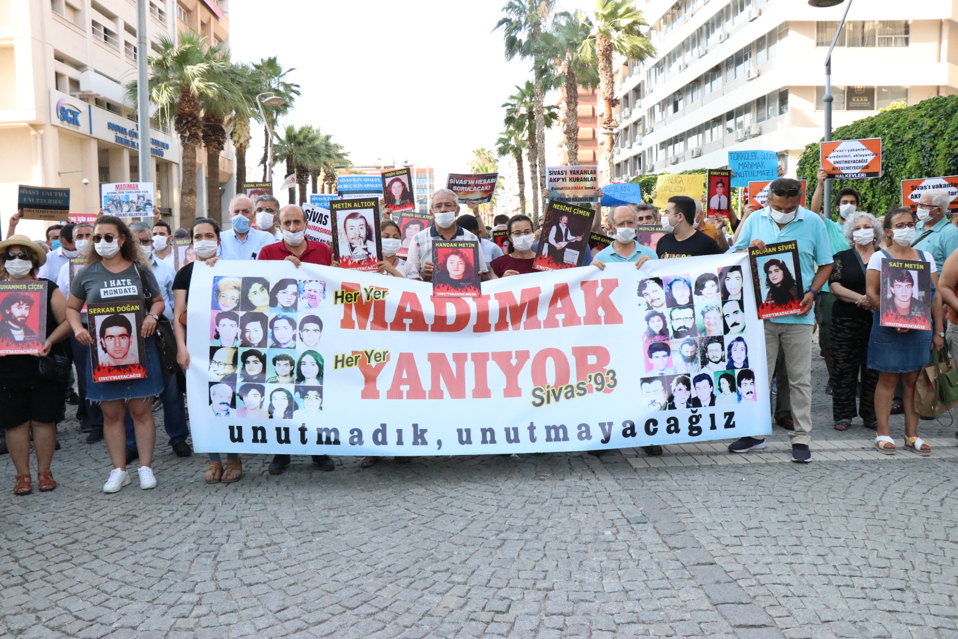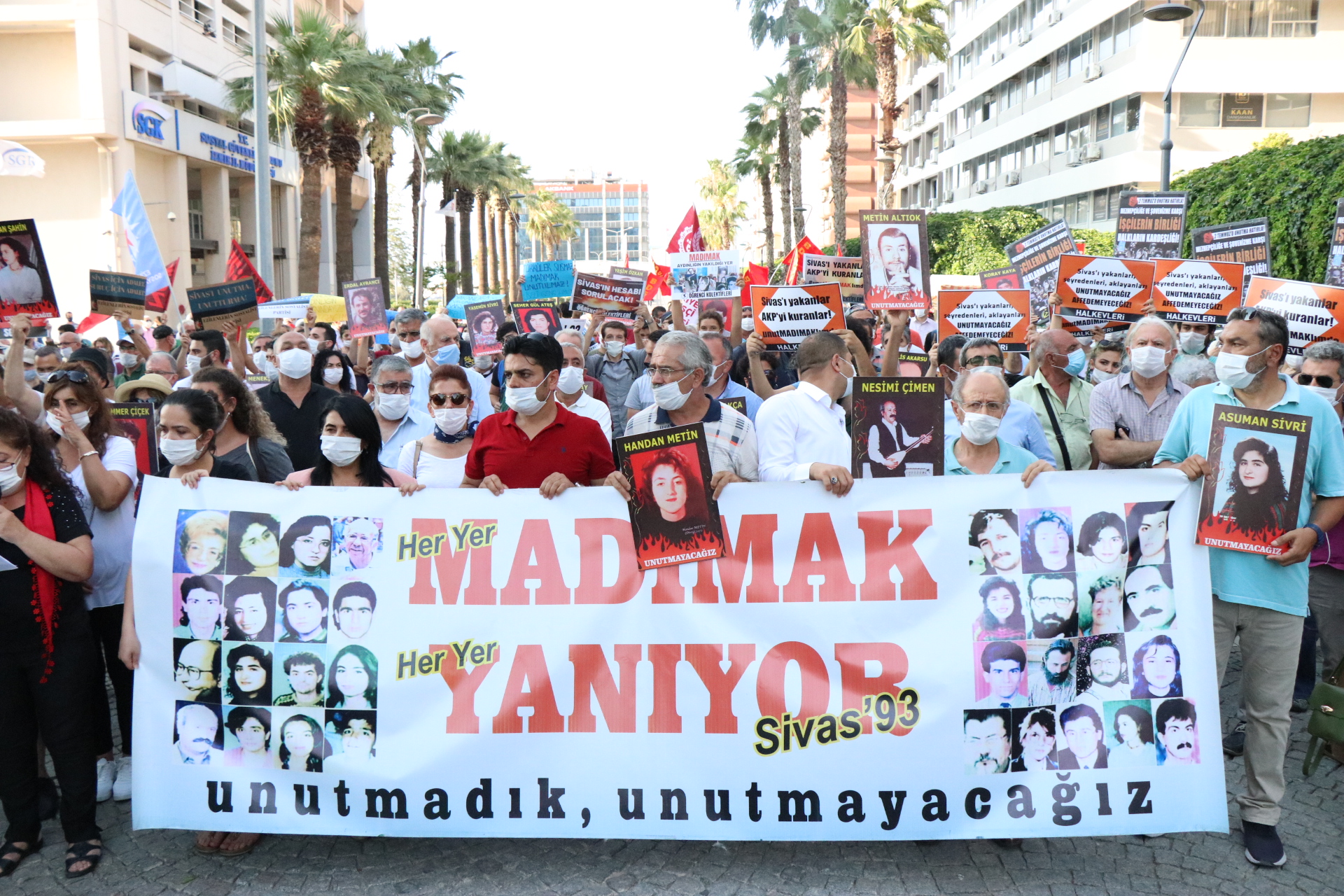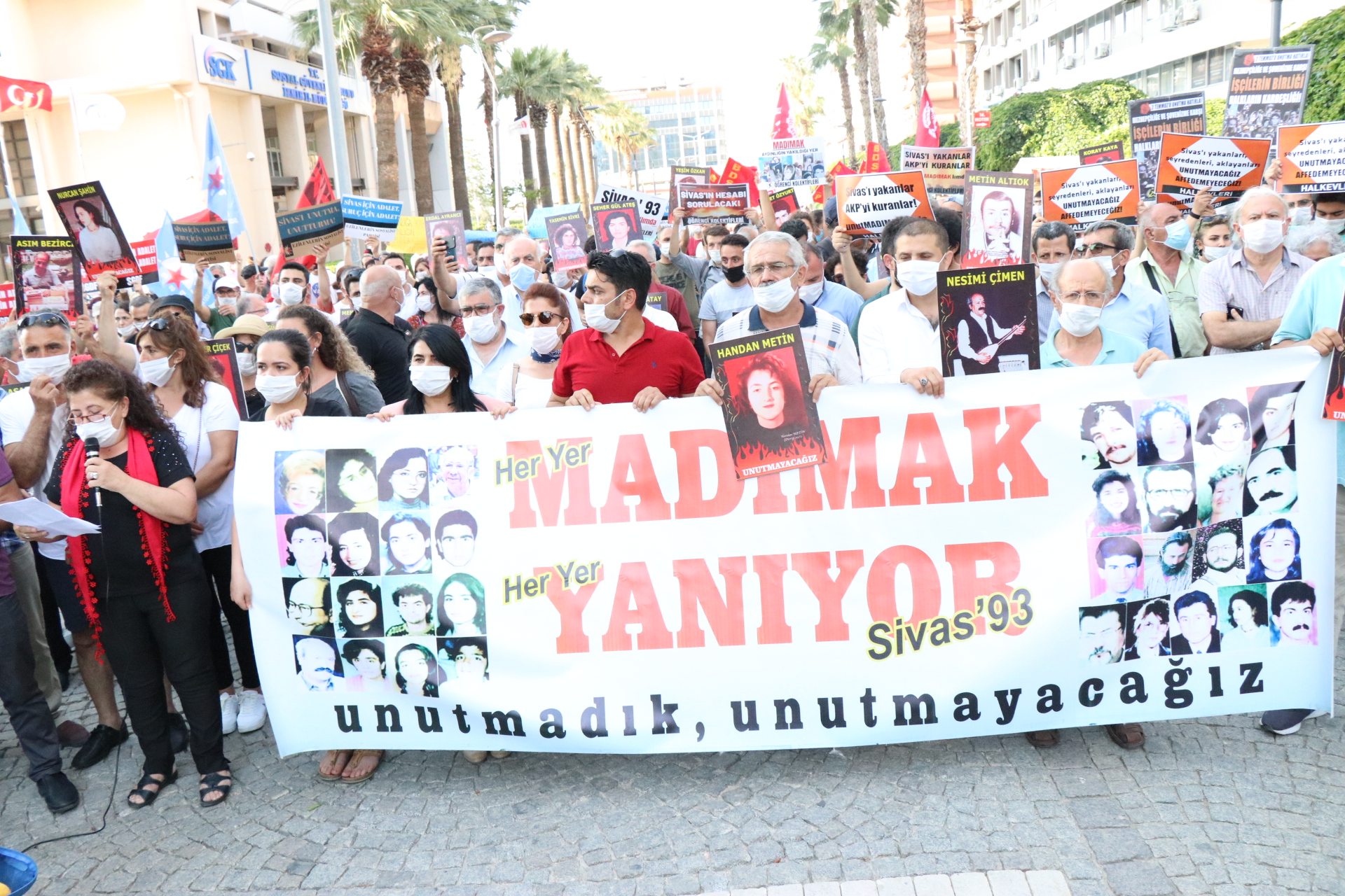İzmir Alevi bileşenleri de Sivas Katliamı’nda yaşamını yitiren 33 can için anma programı düzenledi. ‘Madımak yanıyor’ pankartının açıldığı eylemde, katliamda hayatını kaybedenlerin fotoğrafları taşındı.