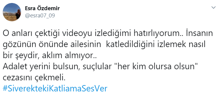 İzol Twitter hesabından yaptığı paylaşımda, “Her şeyi en başından anlatacağım bilin.. bilin ki kadın başımıza nasıl bir haksızlıkla mücadele etmeye çalıştık yıllarca, 17 yıldır nasıl ayakta durmaya çalıştık” diyerek yaşanılanları #SiverektekiKatliamaSesVer etiketiyle paylaştı.