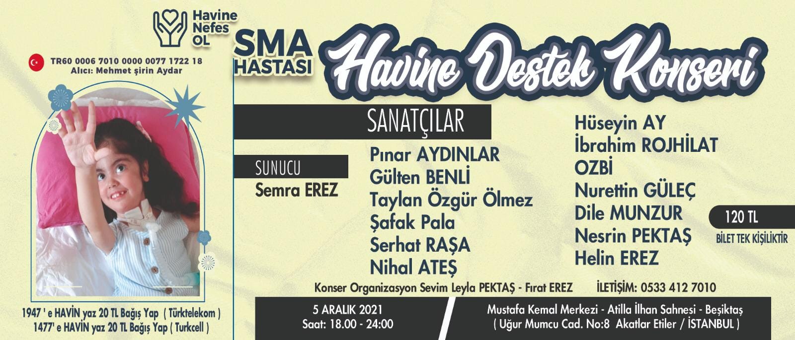 Türkiye’deki binlerce Spinal Muskuler Atrofi (SMA) hastası çocuktan biri olan Havin Ömür Aydar‘ın tedavisi için başlatılan dayanışma kampanyası devam ediyor. Kampanya kapsamında 5 Aralık 2021 Pazar günü İstanbul Beşiktaş’ta Havin Ömür için destek konseri düzenlenecek.