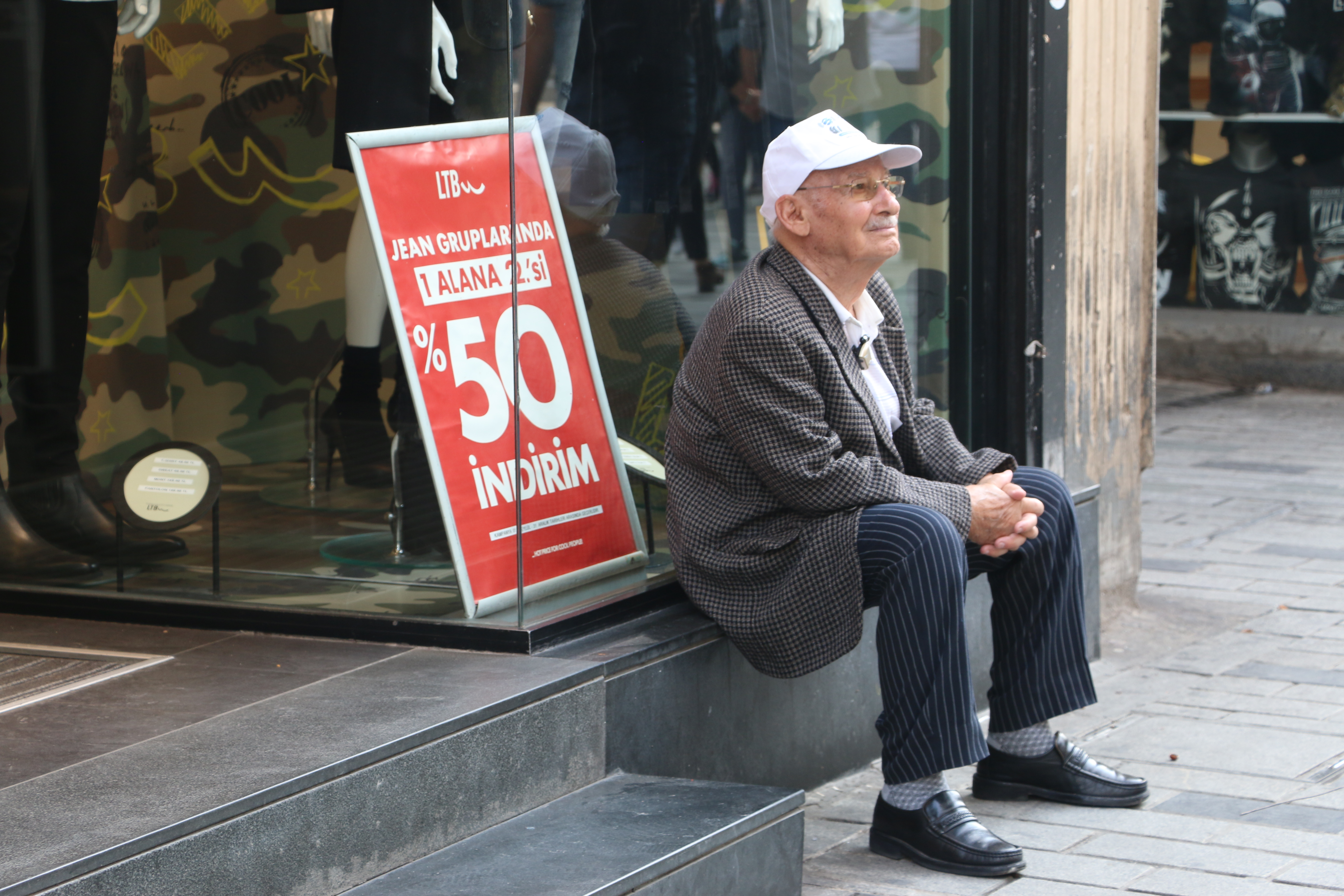 İndirim yazan bir mağazanın önünde oturan yaşlı bir amca ile karşılaşıyoruz önce. Emekli amca maaşının 1200 TL’sini otele veriyor. Çamaşırlarını geçen yıl 8 TL’ye yıkayan amca bu yıl 25 TL’ye yıkatabiliyor. “Türkiye bitmiş. Durum kötü, yani bildiğin gibi değil” diye yorumluyor ekonomik krizi.