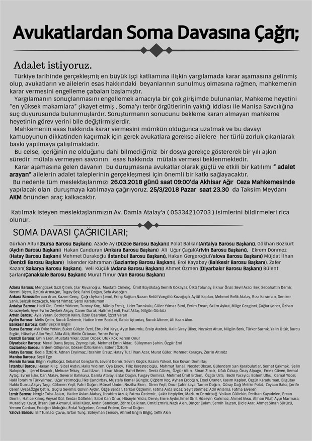 Aralarında çok sayıda ilin baro başkanlarının da yer aldığı avukatlar, 301 işçinin yaşamını yitirdiği Soma davasına çağrı yaptı.
