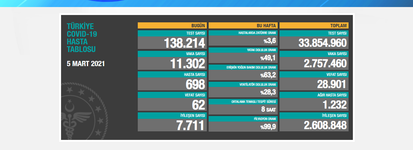 Tabloya göre, toplam test sayısı 33 milyon 854 bin 960, toplam ağır hasta sayısı bin 232, toplam iyileşen sayısı 2 milyon 608 bin 848 olarak kayıtlara geçti.