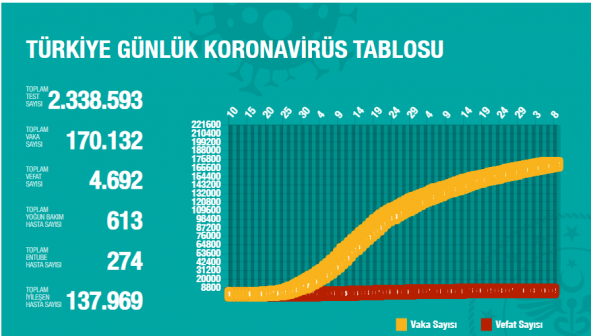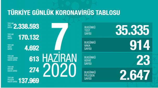Sağlık Bakanlığı Son 24 saatin koronavirüs durumunu açıkladı. Bakanlık, dünden bugüne 35.335 test yapıldığını, yapılan testlerden 914 yeni vaka tespiti görüldüğünü açıkladı. Yine Bakanlık verilerine göre toplamda can kaybı 4.692′ e yükselirken toplamda 2 Milyon 338 bin 593 test gerçekleştirildi. İyileşen hastaların sayısı da 137.969 olarak belirtildi.