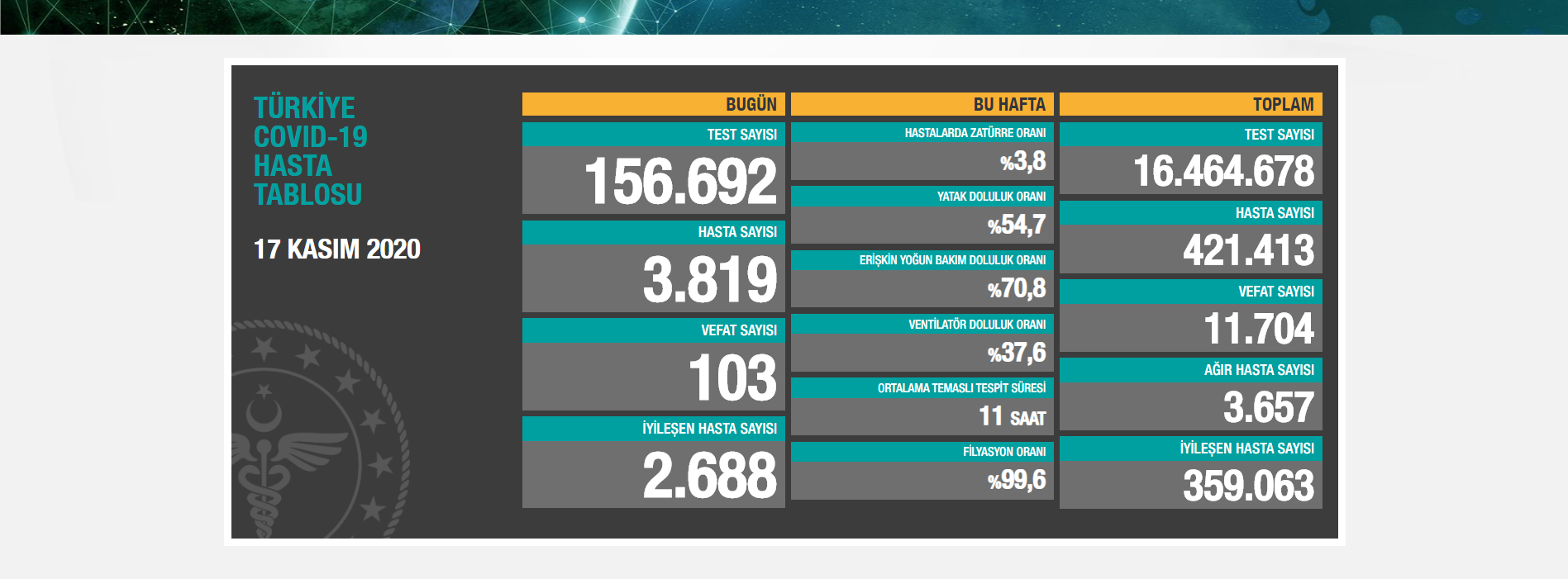 Türkiye’de koronavirüs nedeniyle son 24 saatte 103 kişi yaşamını yitirdi, 3 bin 819 yeni hasta tespit edildi. Virüs nedeniyle hayatını kaybedenlerin toplam sayısı 11 bin 704’e, toplam hasta sayısı 421 bin 413’e yükseldi. Bugünkü iyileşen hasta sayısı 2 bin 668 olurken, toplam iyileşen hasta sayısı 359 bin 063’e ulaştı. Hastalarda zatürre oranı yüzde 3.8 olarak açıklanırken, ağır hasta sayısı 3 bin 657’e yükseldi.
